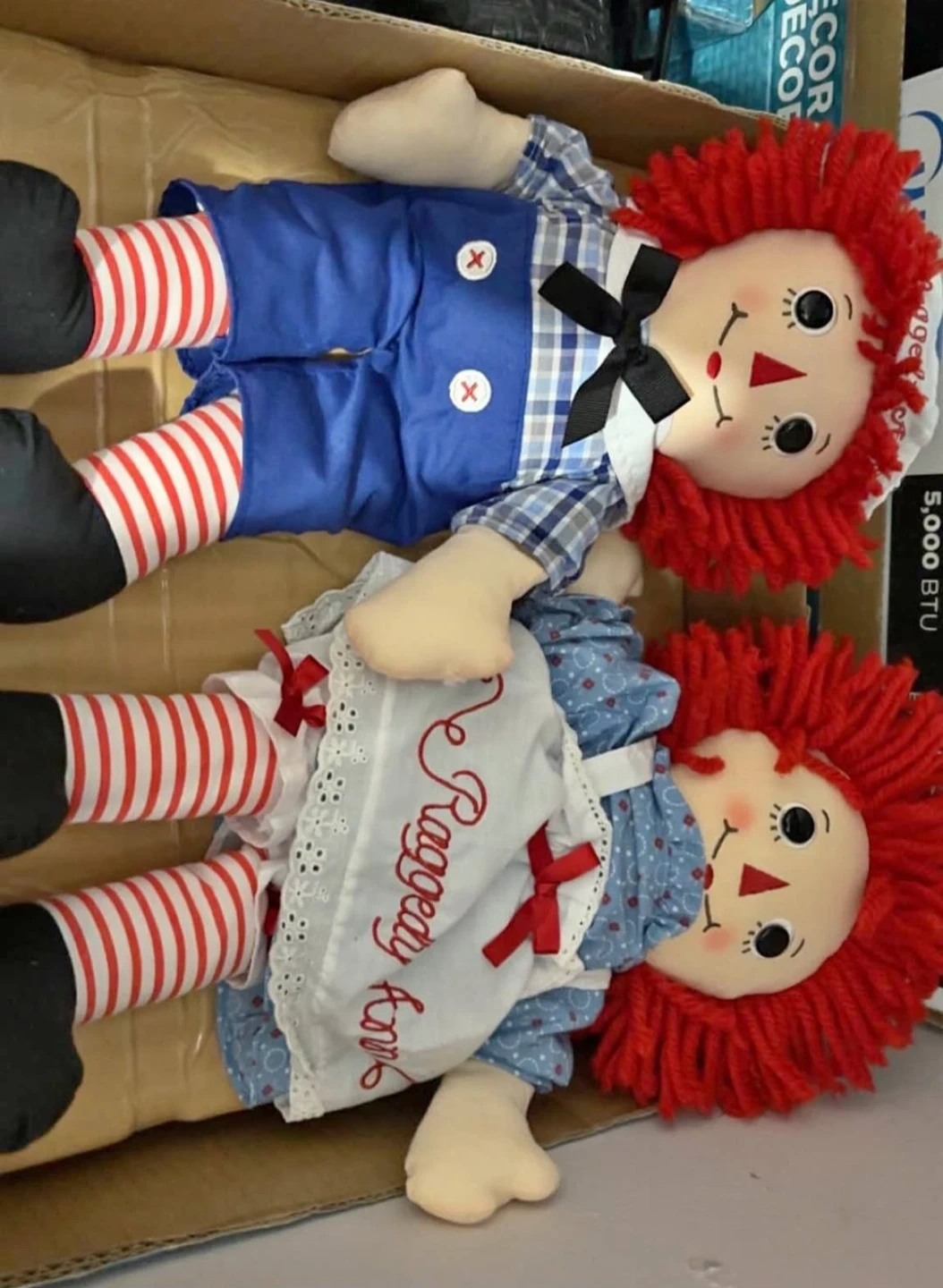 Classic Raggedy Ann and Raggedy Andy dolls. Ann wears a blue floral dress and a white apron embroidered with her name. Andy is dressed in blue overalls and a blue and white checkered shirt with a black bowtie. Both dolls have red yarn hair and striped leggings.
