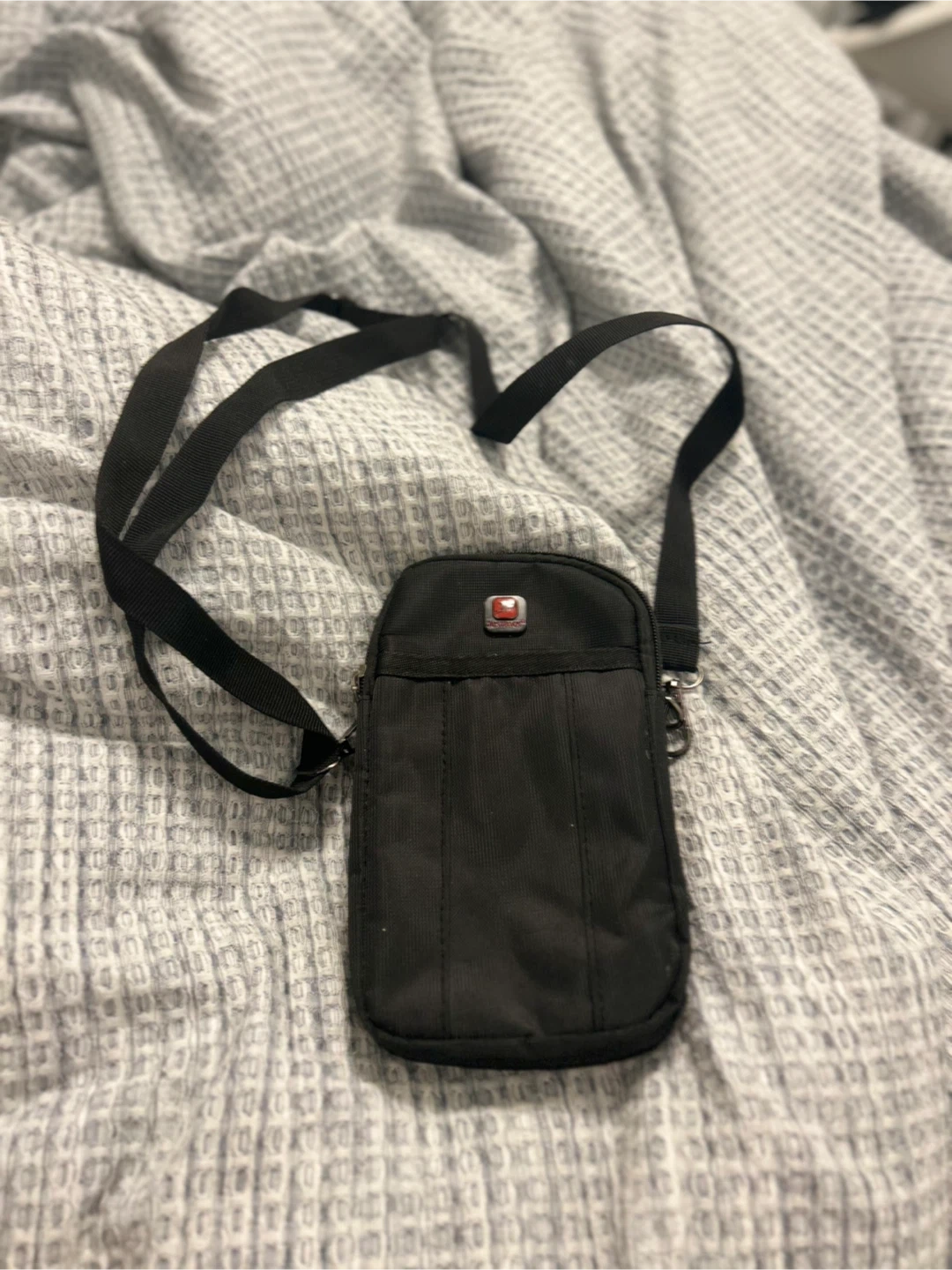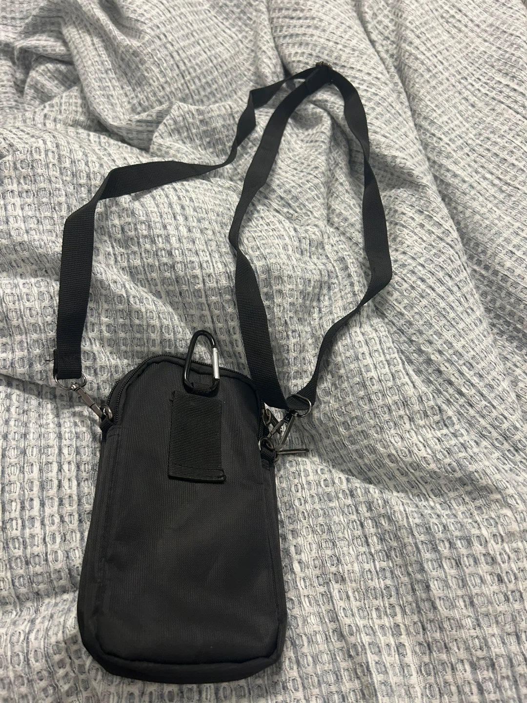 This is a black crossbody bag with an adjustable strap. It's made of durable material and has a zippered main compartment. A handy accessory for carrying essentials.