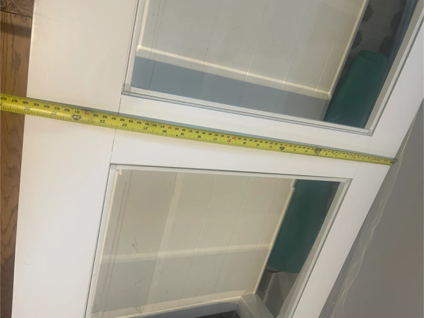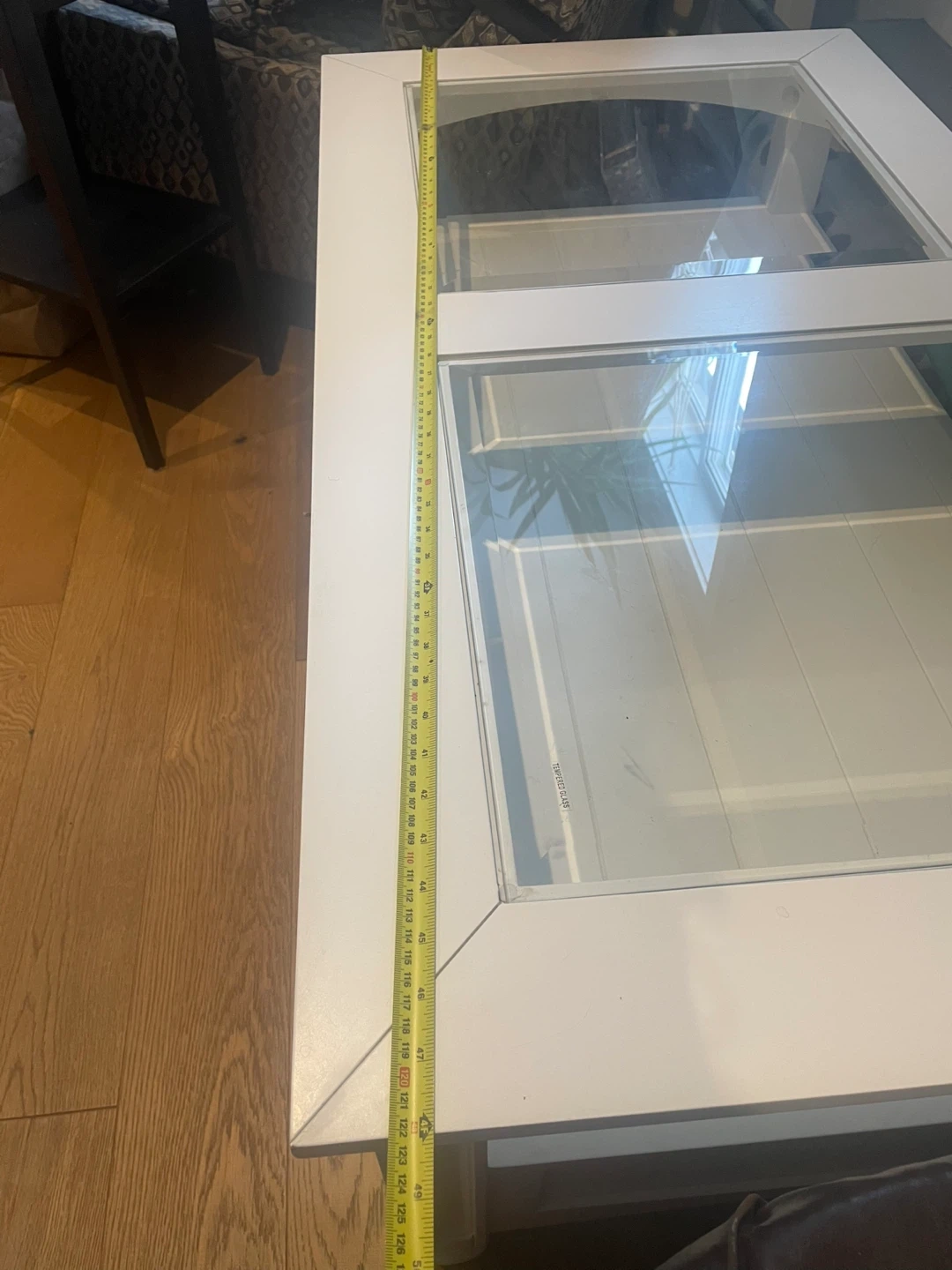 A white coffee table featuring a glass top and two drawers for storage. It's made of wood and has a shelf beneath the drawers. The table measures approximately 48 inches long and 24 inches wide. Ikea Idanas coffee table $399+ tax in store