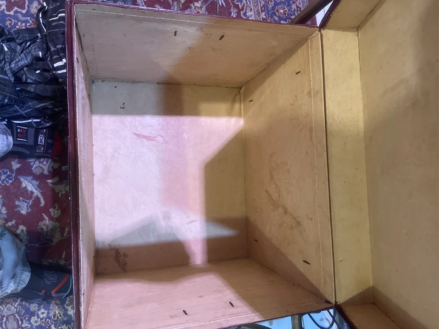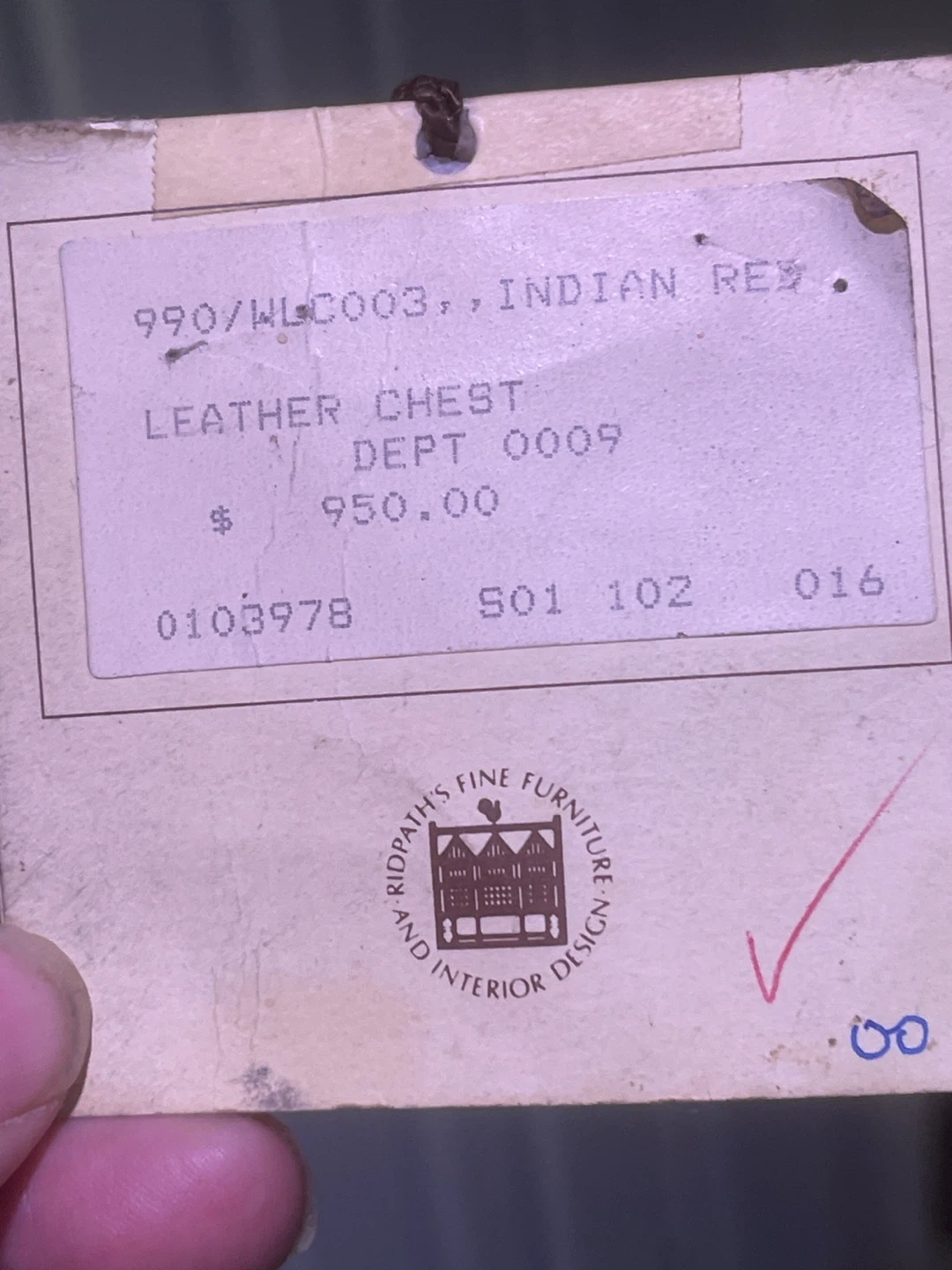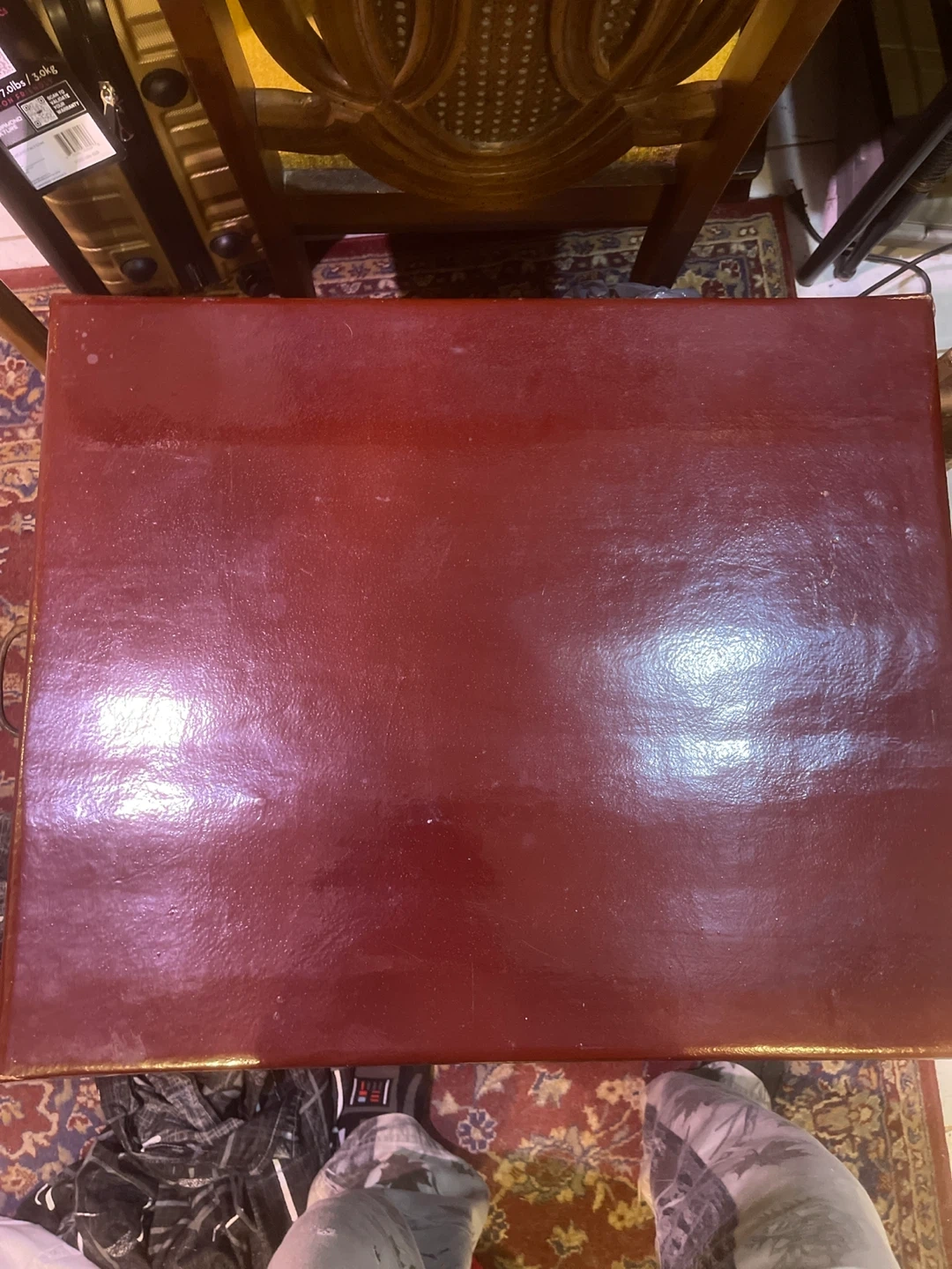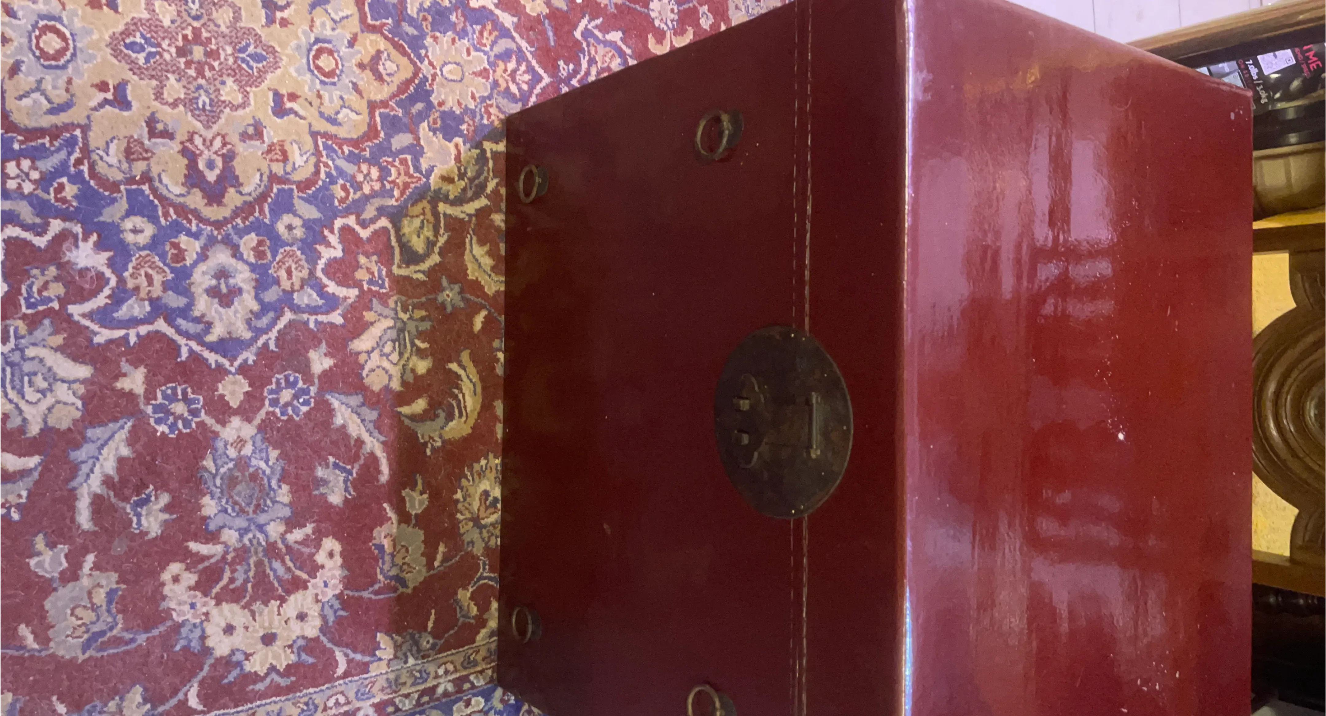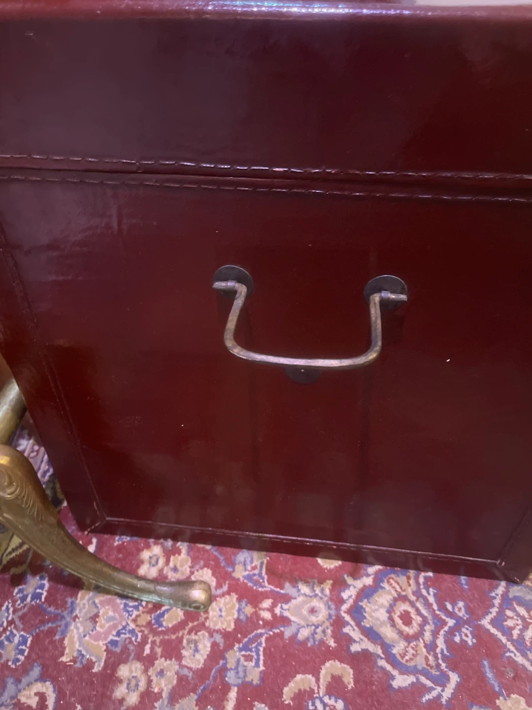 A vintage leather chest from Ridpath's Fine Furniture. It's a deep Indian Red colour and includes a handles for carrying. This chest would be useful for storing linens or travel items.