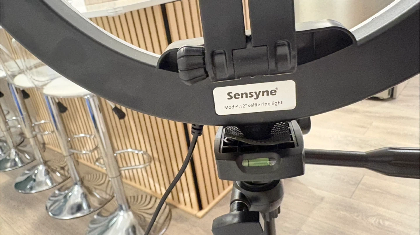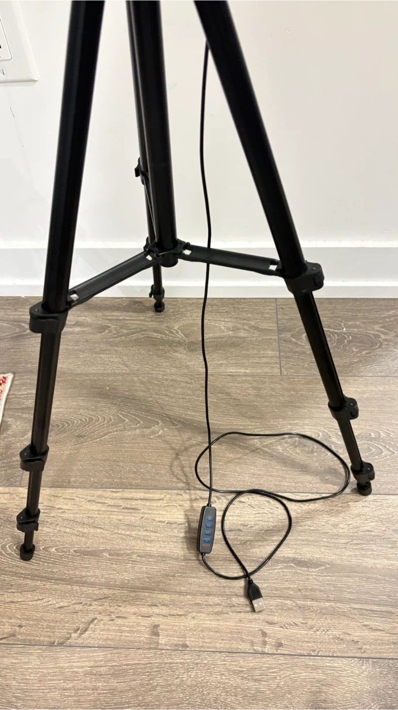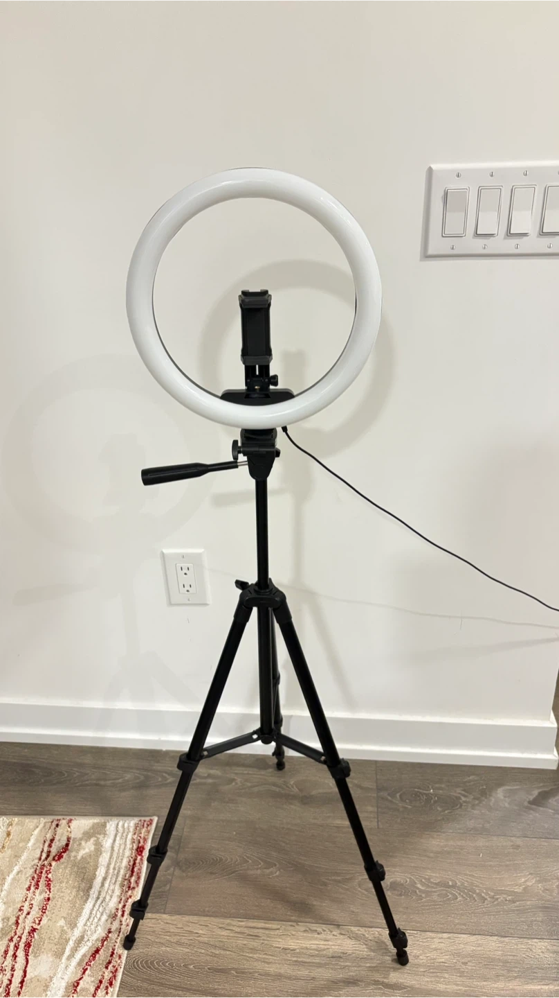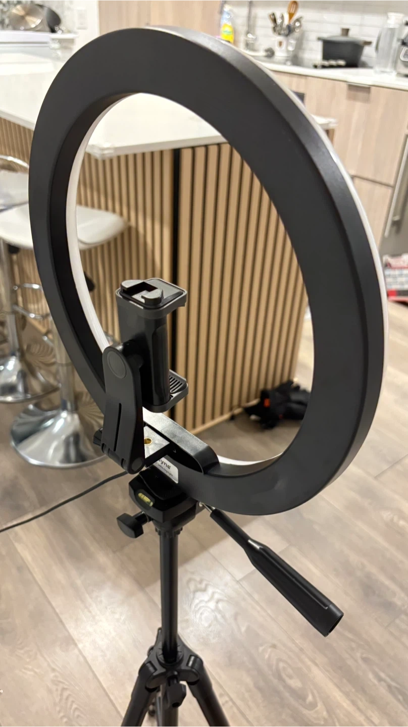This is a ring light setup for content creation. It includes a ring light, a phone holder, and an adjustable tripod. The light has multiple brightness settings. It's great for selfies, videos, and makeup application.
