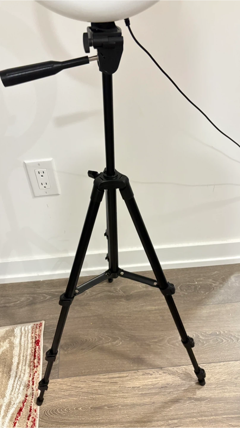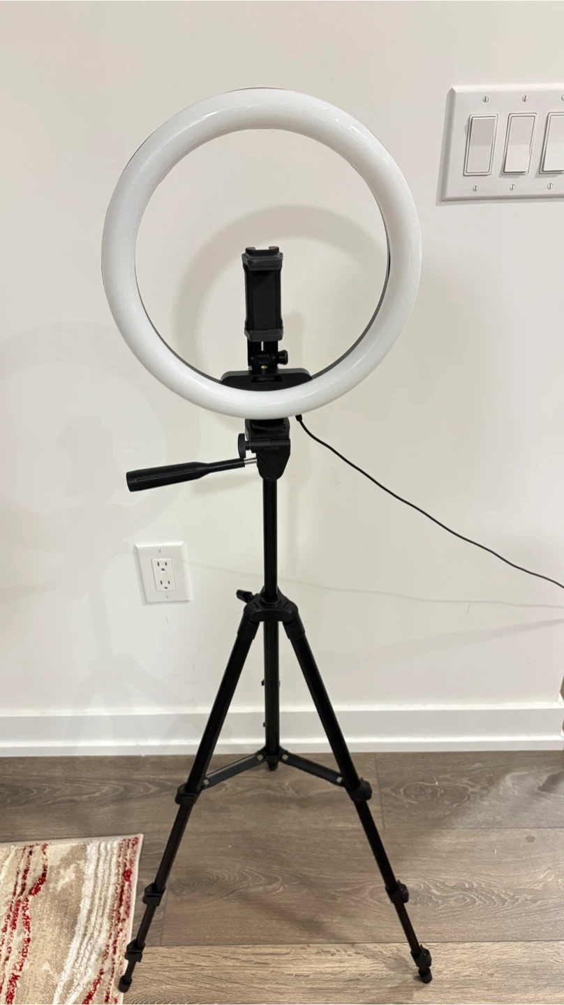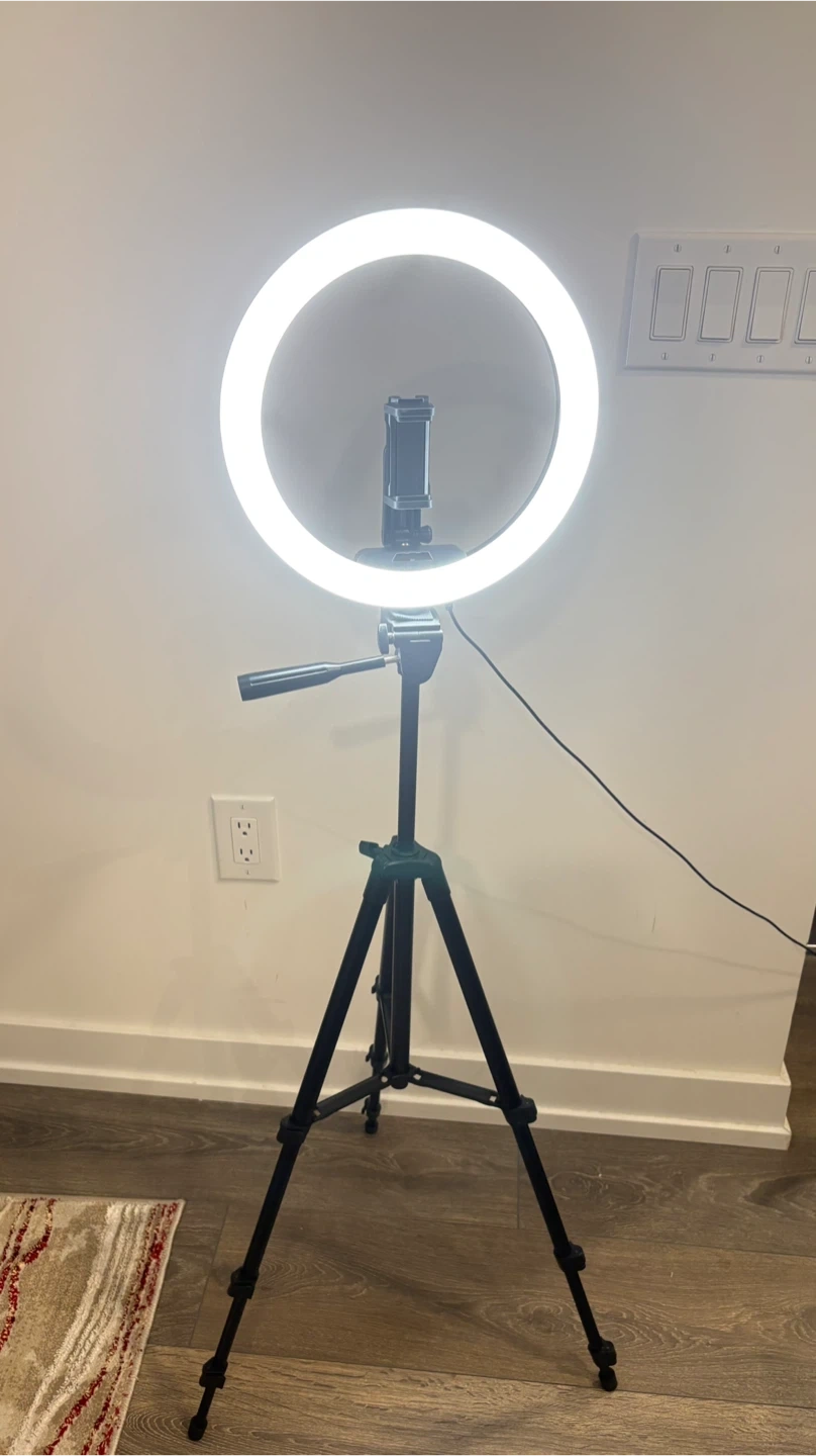 This is a ring light setup for content creation. It includes a ring light, a phone holder, and an adjustable tripod. The light has multiple brightness settings. It's great for selfies, videos, and makeup application.