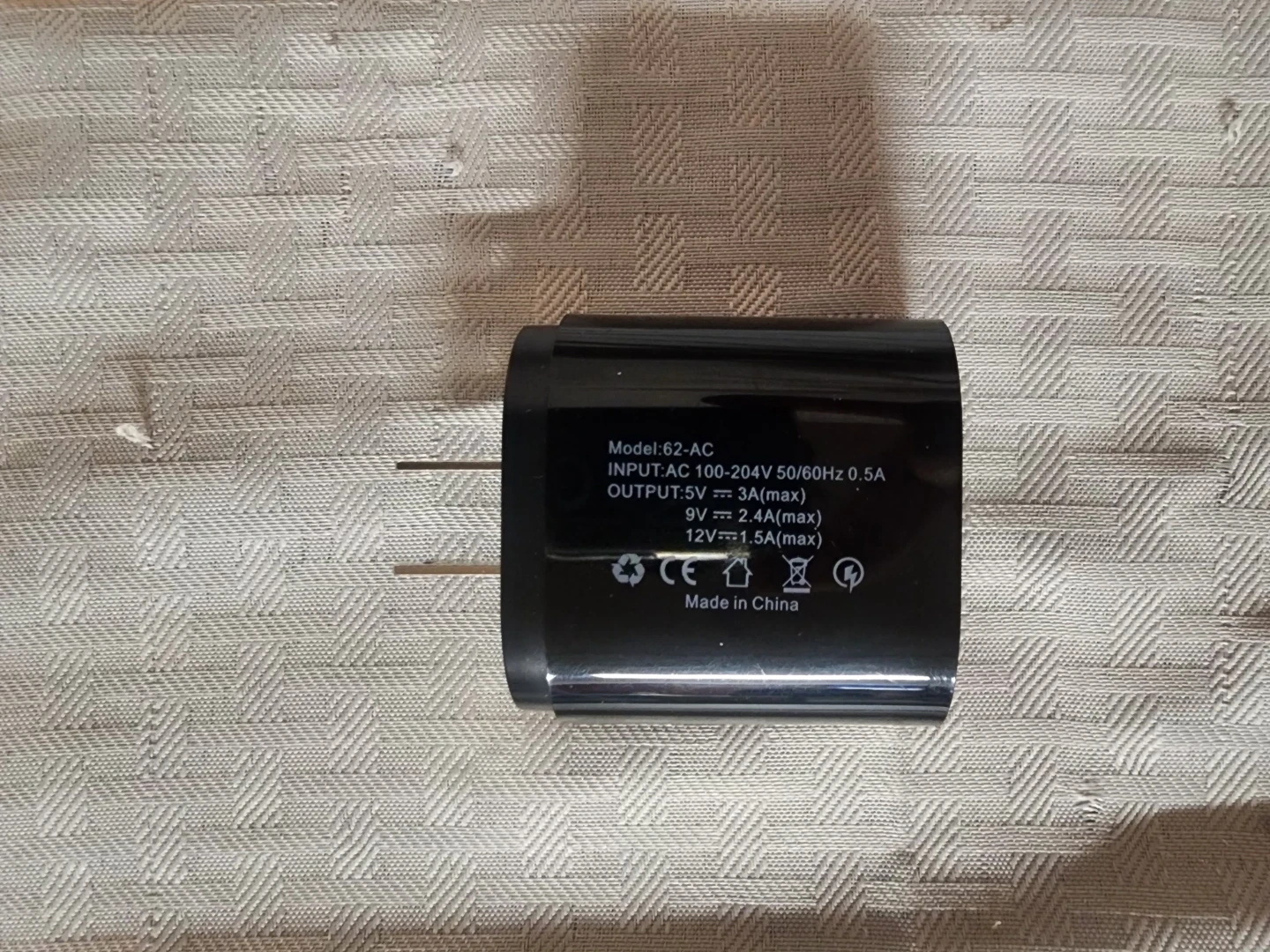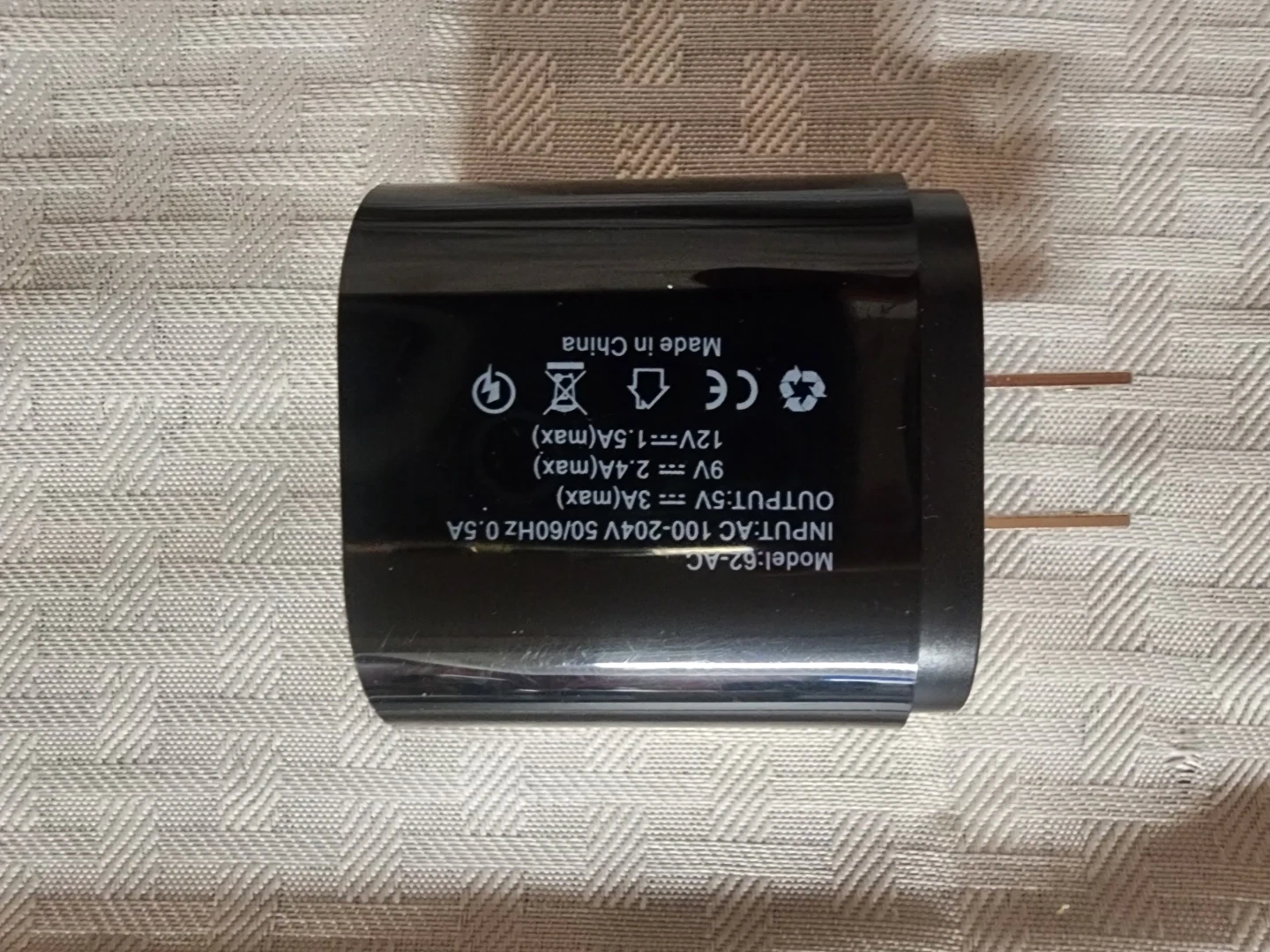 This black wall charger offers 36W of power with both a USB-C PD port and a Quick Charge 3.0 port. It supports a wide input voltage range of AC 100-204V. Model is 62-AC, made in China. Multiple devices can be charged quickly from this unit.