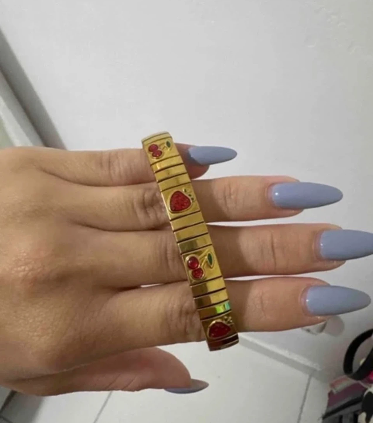 This is a gold-plated stainless steel bracelet. It features a cute fruit design with strawberries and cherries. The bracelet weighs 12g.