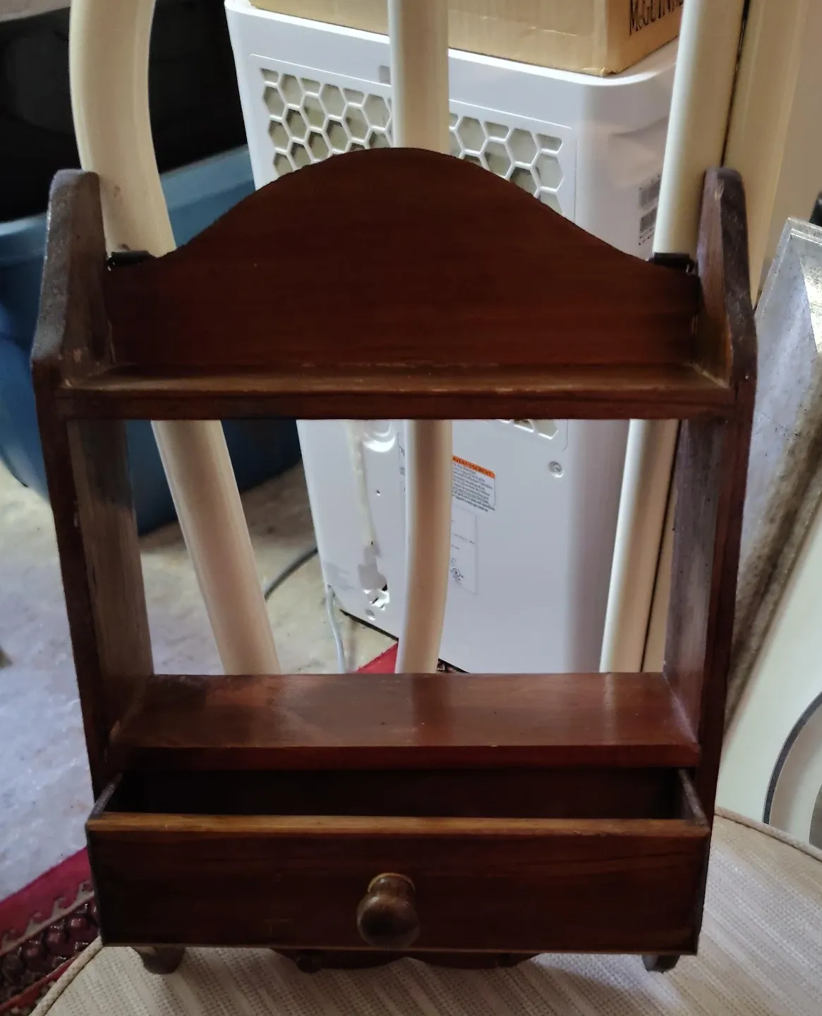 This is a charming wooden shelf with a small drawer. It's made of solid wood and features a decorative arched top. Perfect for displaying small items or for organizing your entryway! Great for adding a rustic touch to any room.
