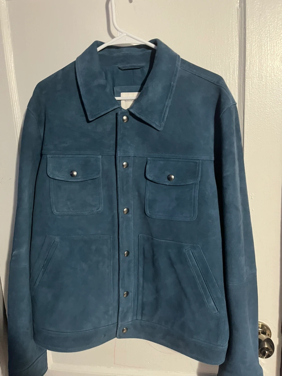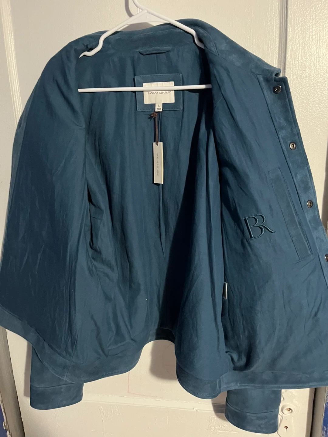 Teal suede trucker jacket from Banana Republic. It's a size large. The jacket features dual chest pockets and has an embroidered 'BR' logo on the inside. Original price was $550.00!