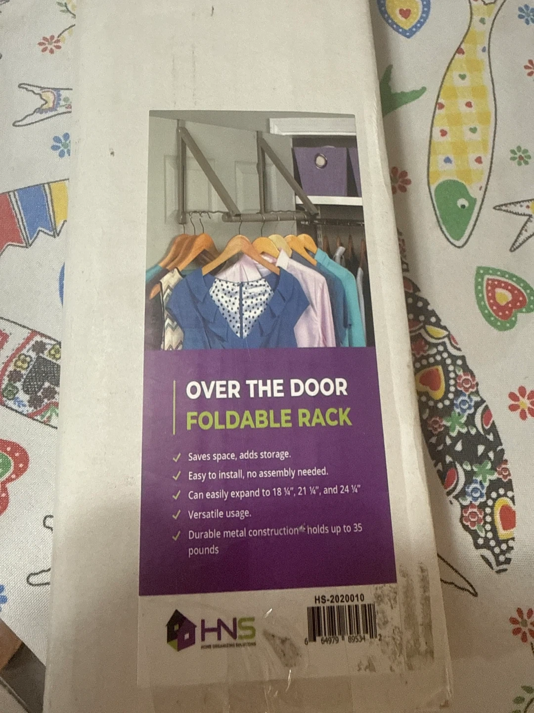 This HNS over the door foldable rack saves space and adds storage. It's easy to install with no assembly needed and can expand to 18 1/2", 21 1/2", and 24 1/4". The durable metal construction holds up to 35 pounds.