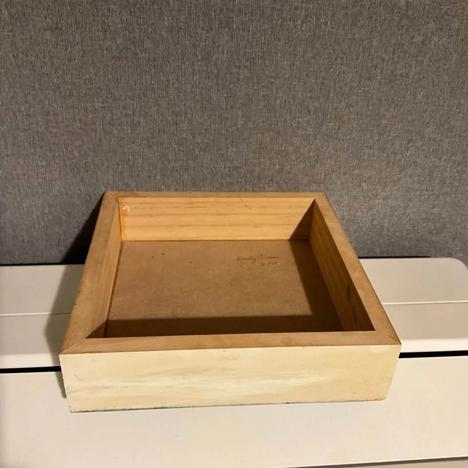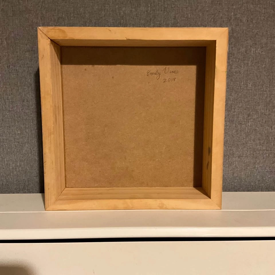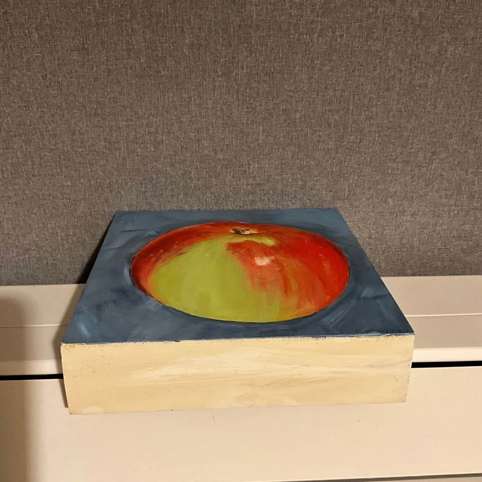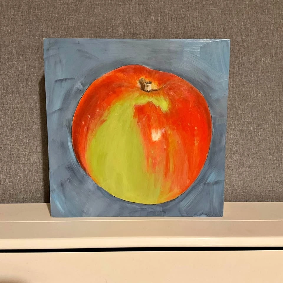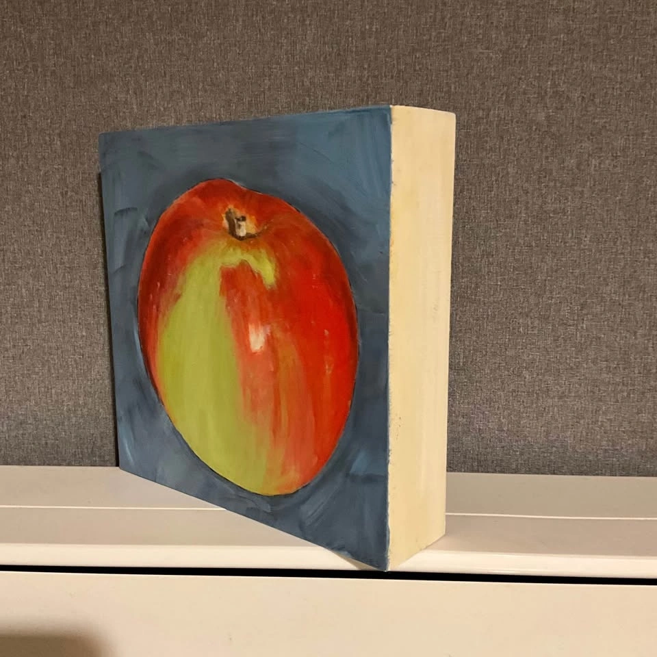 Vibrant original painting by Emily Vines. This cool piece has a bright red and green apple on a blue-grey background. Painted in 2018 on a sturdy wood block. Pre owned. Pickup is 58th and 7th Ave in midtown Manhattan.