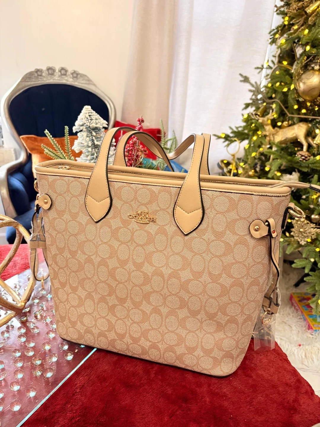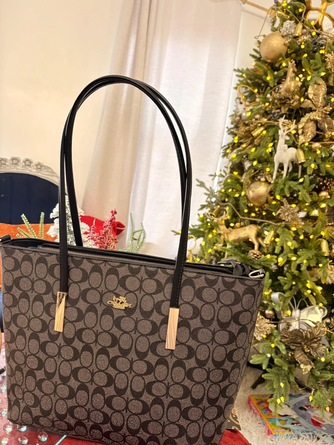 This Coach tote bag features the signature C pattern. It has a zip-top closure and interior pockets. Leather trim and handles.