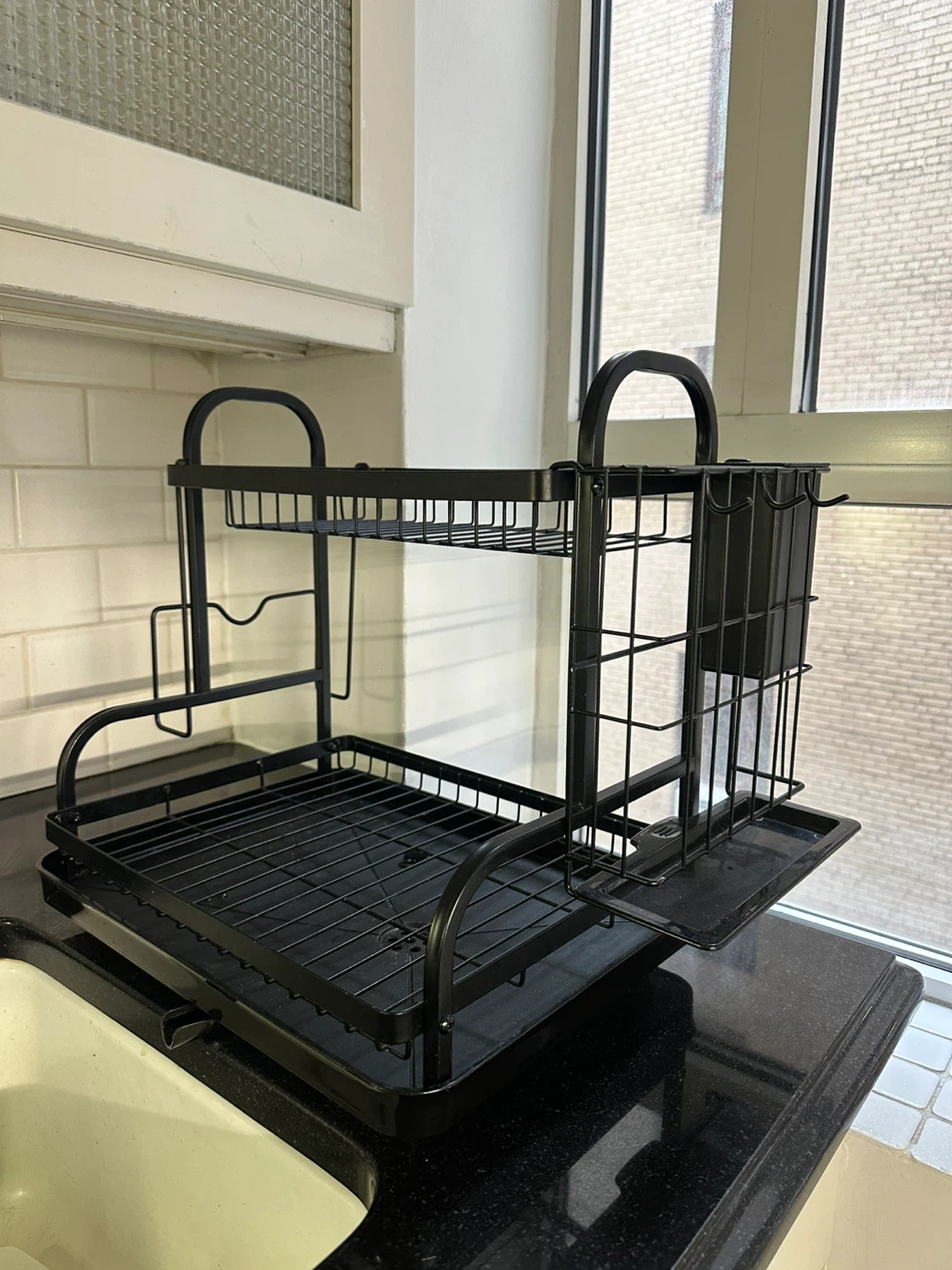 a sturdy, black, two-tier dish drying rack. It's in great condition and perfect for keeping your kitchen organized. It has a sleek design and offers ample space for drying dishes, glasses, and utensils.