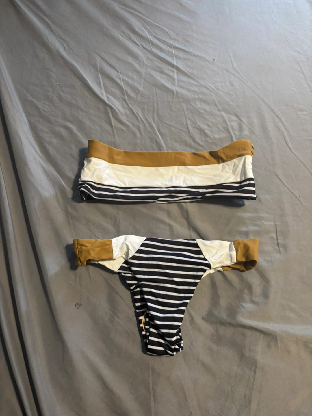 This is a two-piece bikini set. It features a striped pattern with gold accents. The material is stretchy.