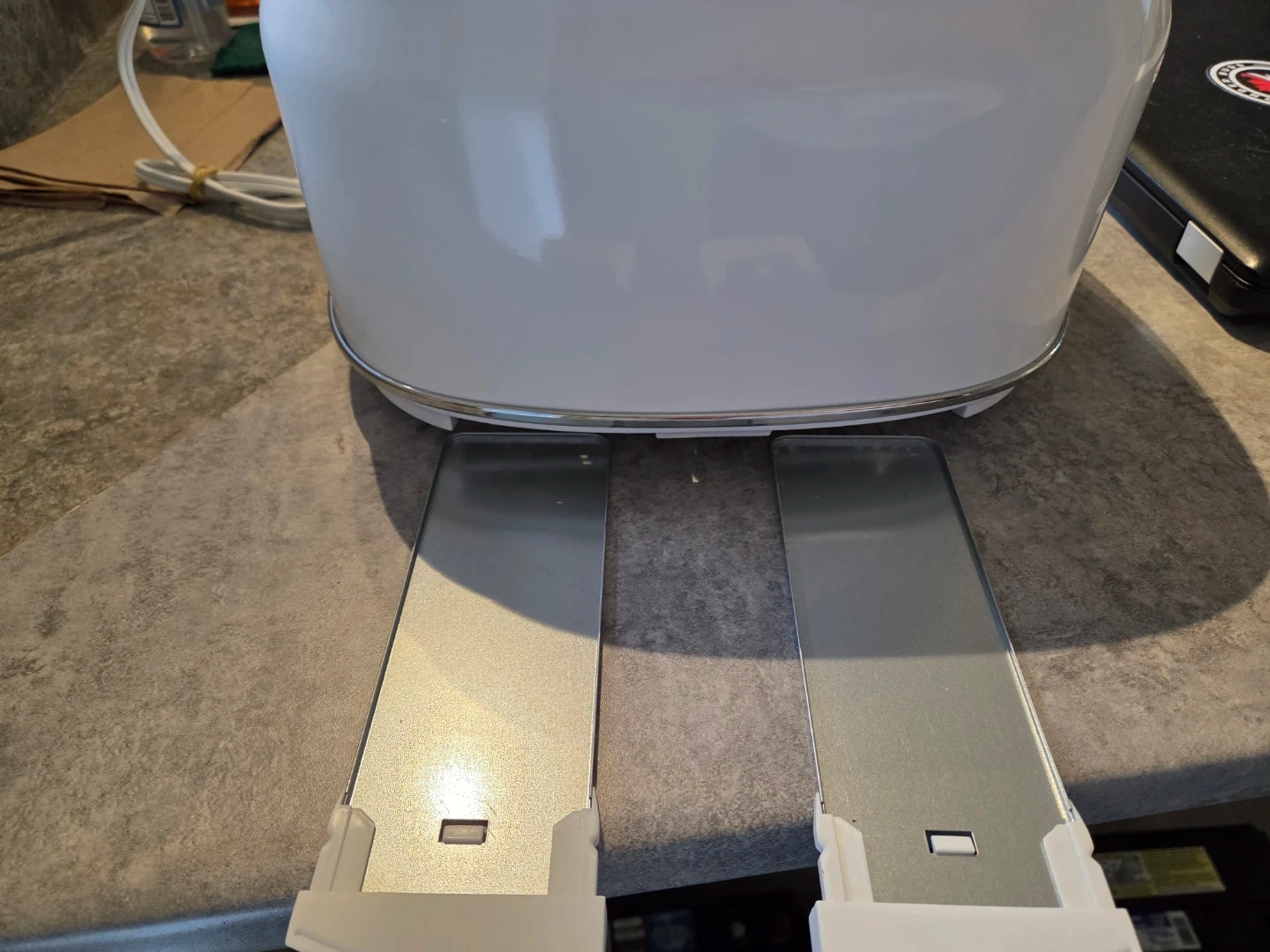 This white Retro style Thinkkitchen 4-slice toaster has reheat and defrost functions. It features a sleek design with chrome accents. Perfect for busy mornings!