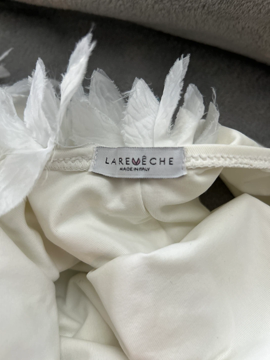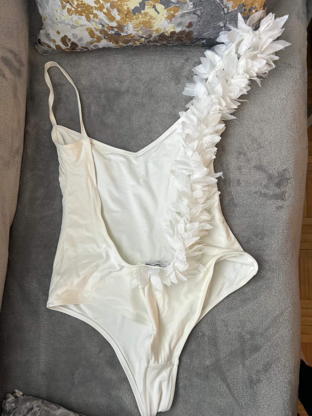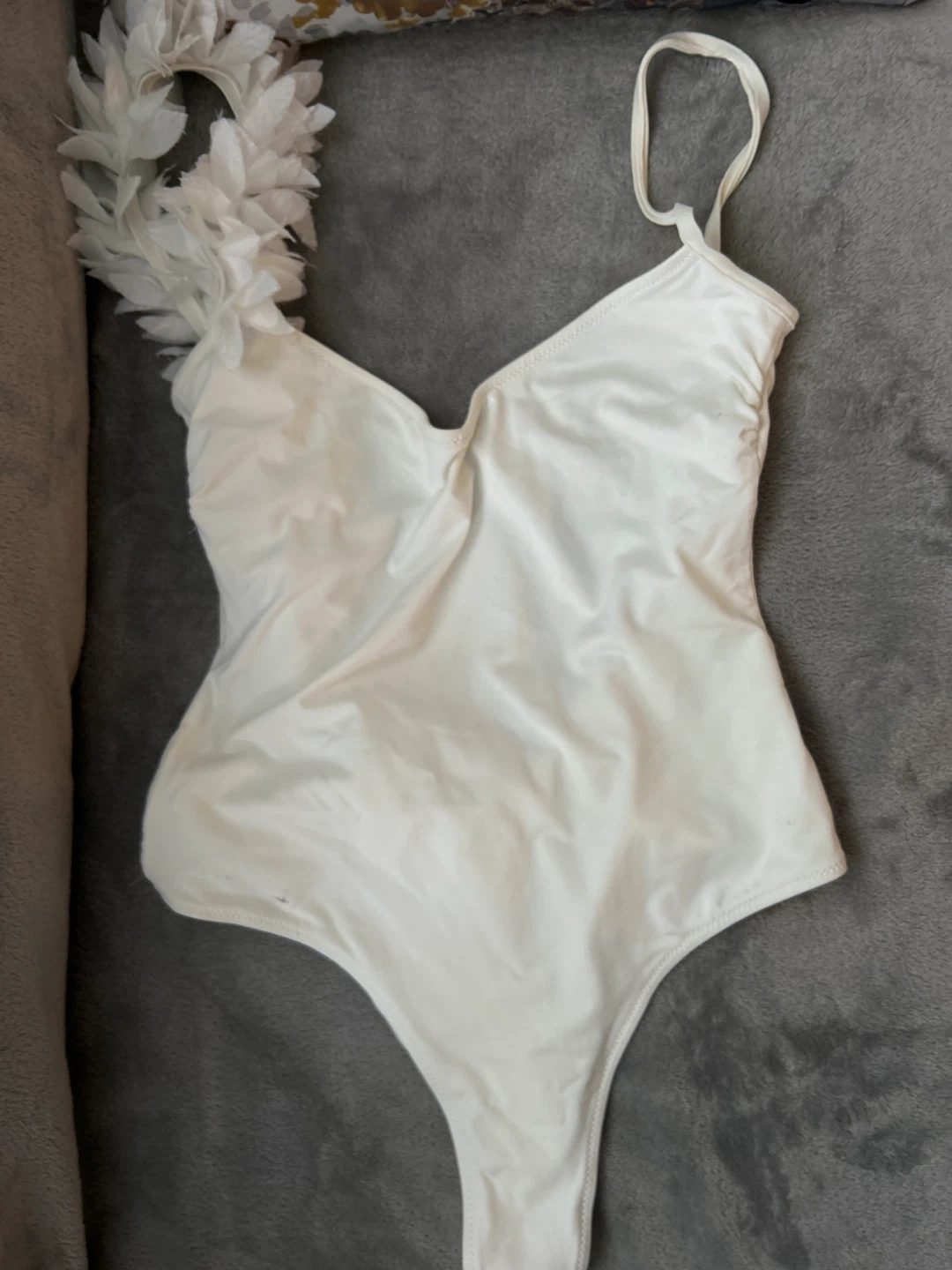 White one-piece swimsuit with ruffled detail on the strap and back. Made in Italy. It's stylish for beach or pool days! Fits S