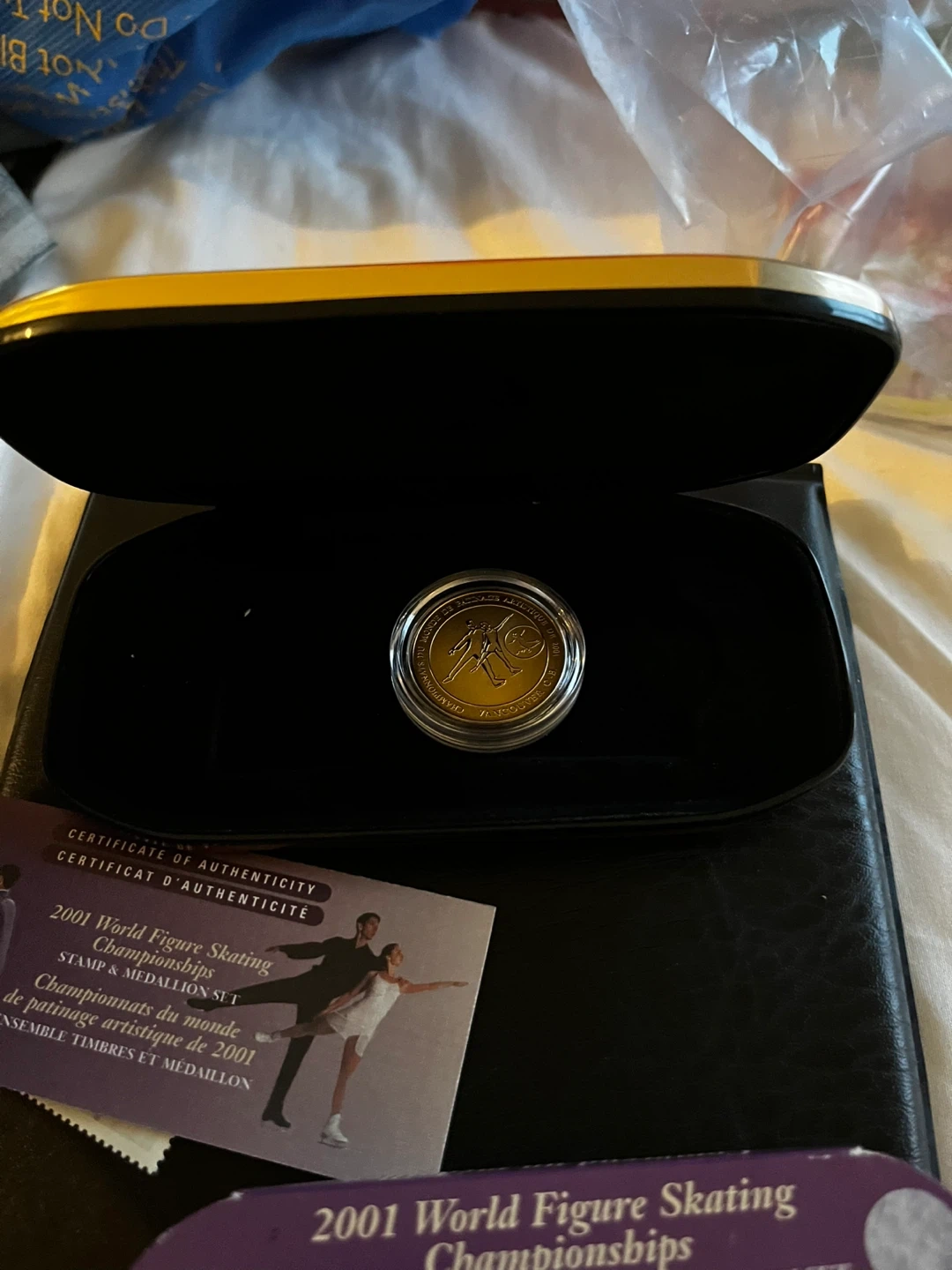 This set includes a 24kt gold-plated medallion and two commemorative stamps from the 2001 World Figure Skating Championships. It comes in a protective case with a certificate of authenticity. The set features images of pairs and ice dance skaters.