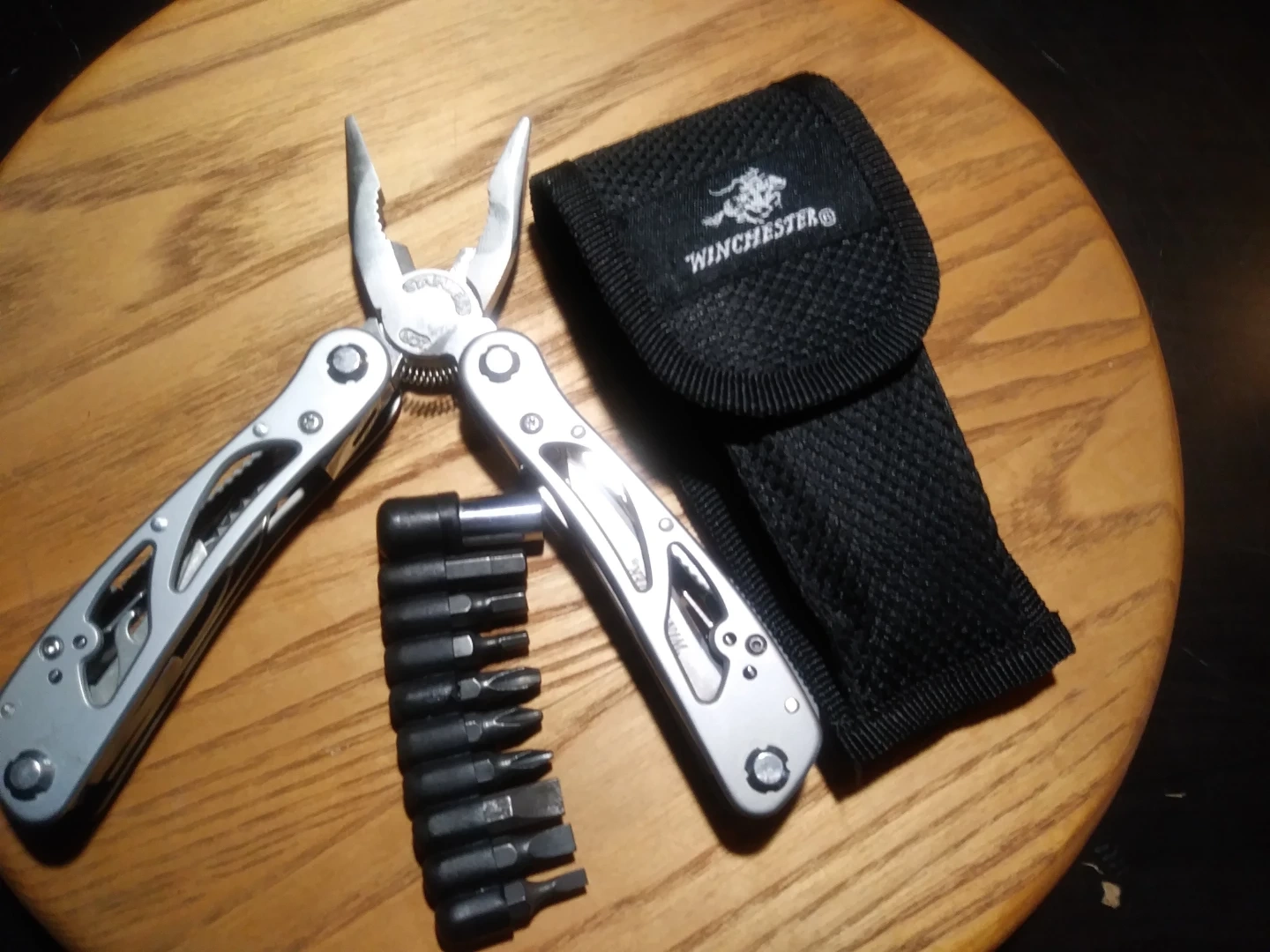 This is a Winchester multi-tool. It includes a variety of bits for different jobs. It also comes with a black nylon carrying pouch. This tool is handy for quick fixes and repairs.