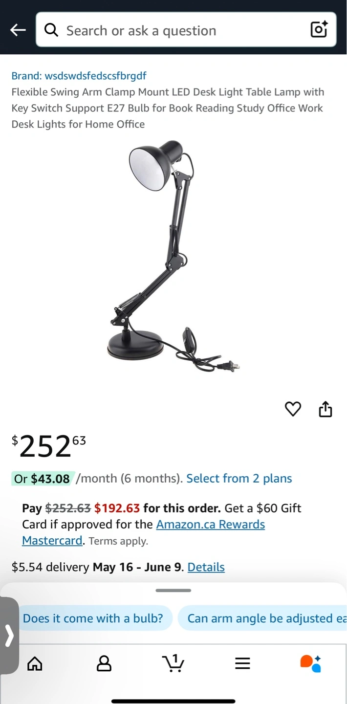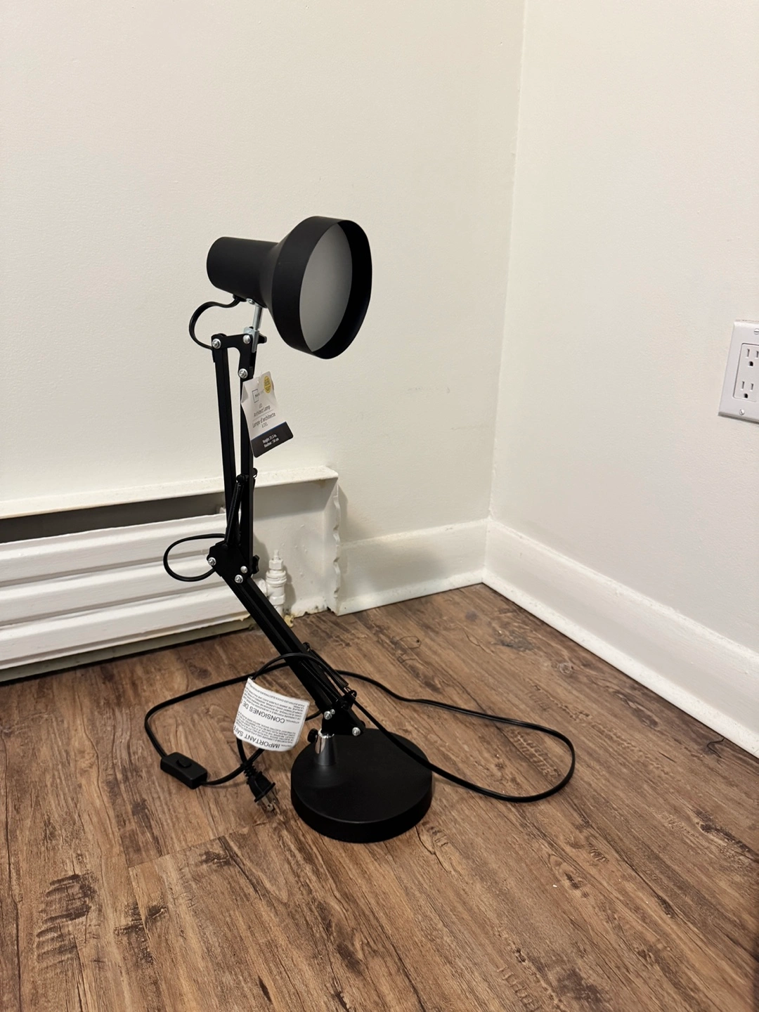 Black metal desk lamp. Adjustable arm and shade. Includes on/off switch. E27 bulb mount.