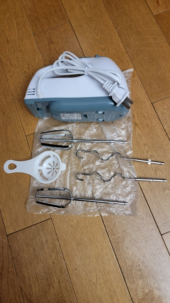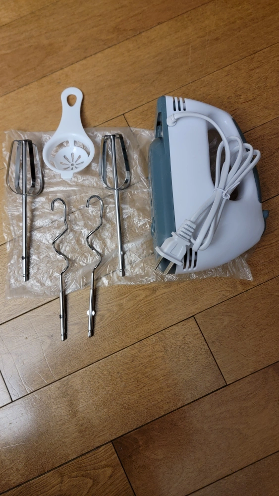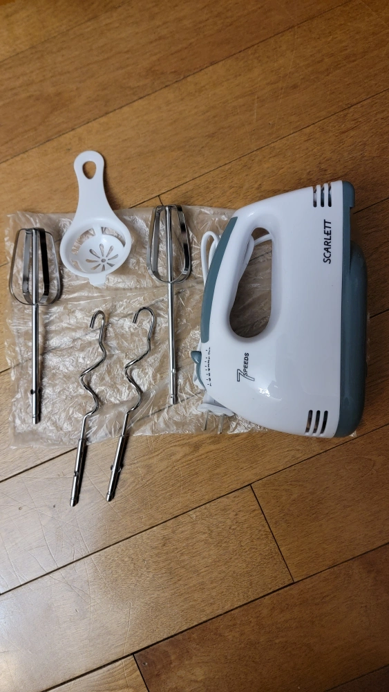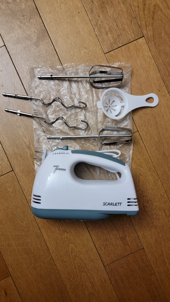 Seven-speed hand mixer. Includes beaters, dough hooks, and egg whisk. New, in original packaging.