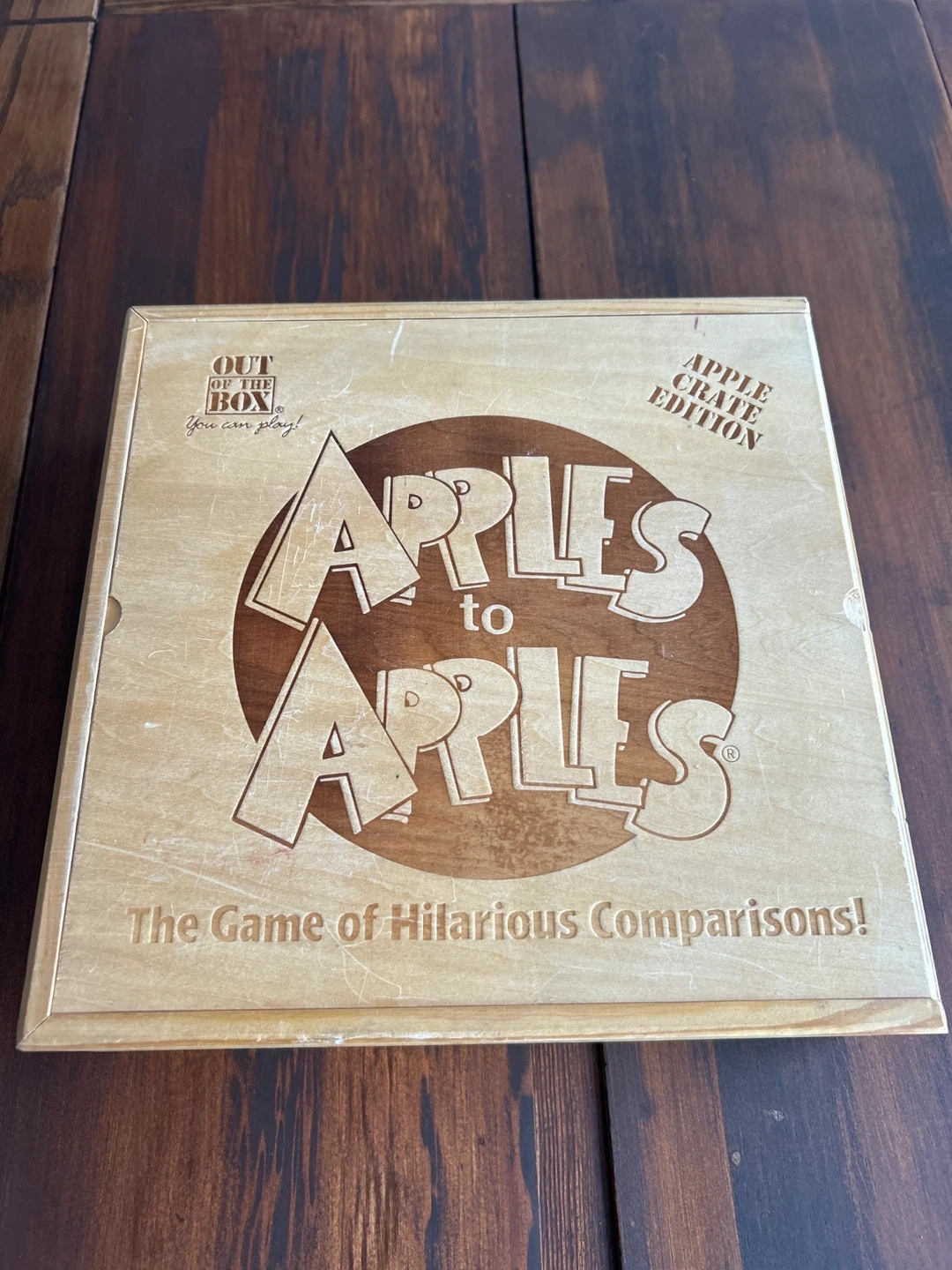 This is the Apples to Apples Apple Crate Edition board game. It's the game of hilarious comparisons. Includes 249 Apple Cards and 49 Red Cards.