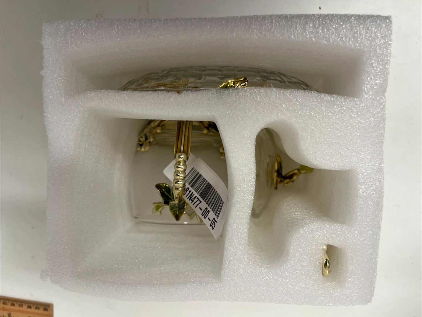 This is a beautiful glass tea set, complete with a matching spoon and lid! The set features delicate floral accents in gold and black, adding a touch of elegance. Perfect for enjoying your favorite tea in style!