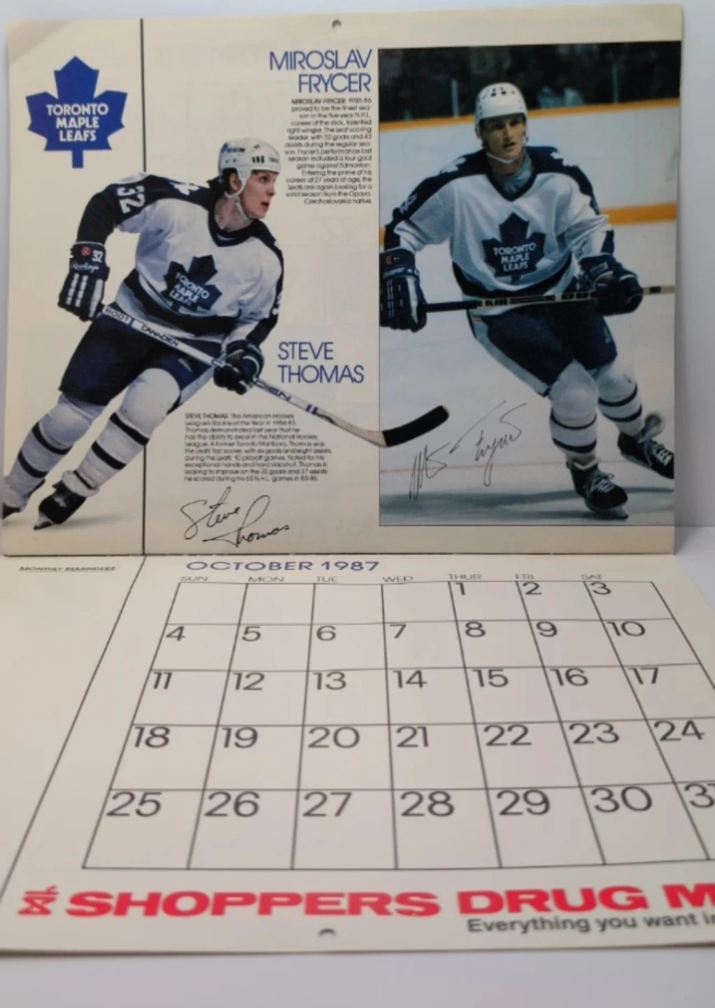 This is the official 1986-87 Toronto Maple Leafs calendar. It features images of players and a hockey rink scene. Inside, you'll find $15.50 worth of valuable coupons from Shoppers Drug Mart. Great for hockey fans!
