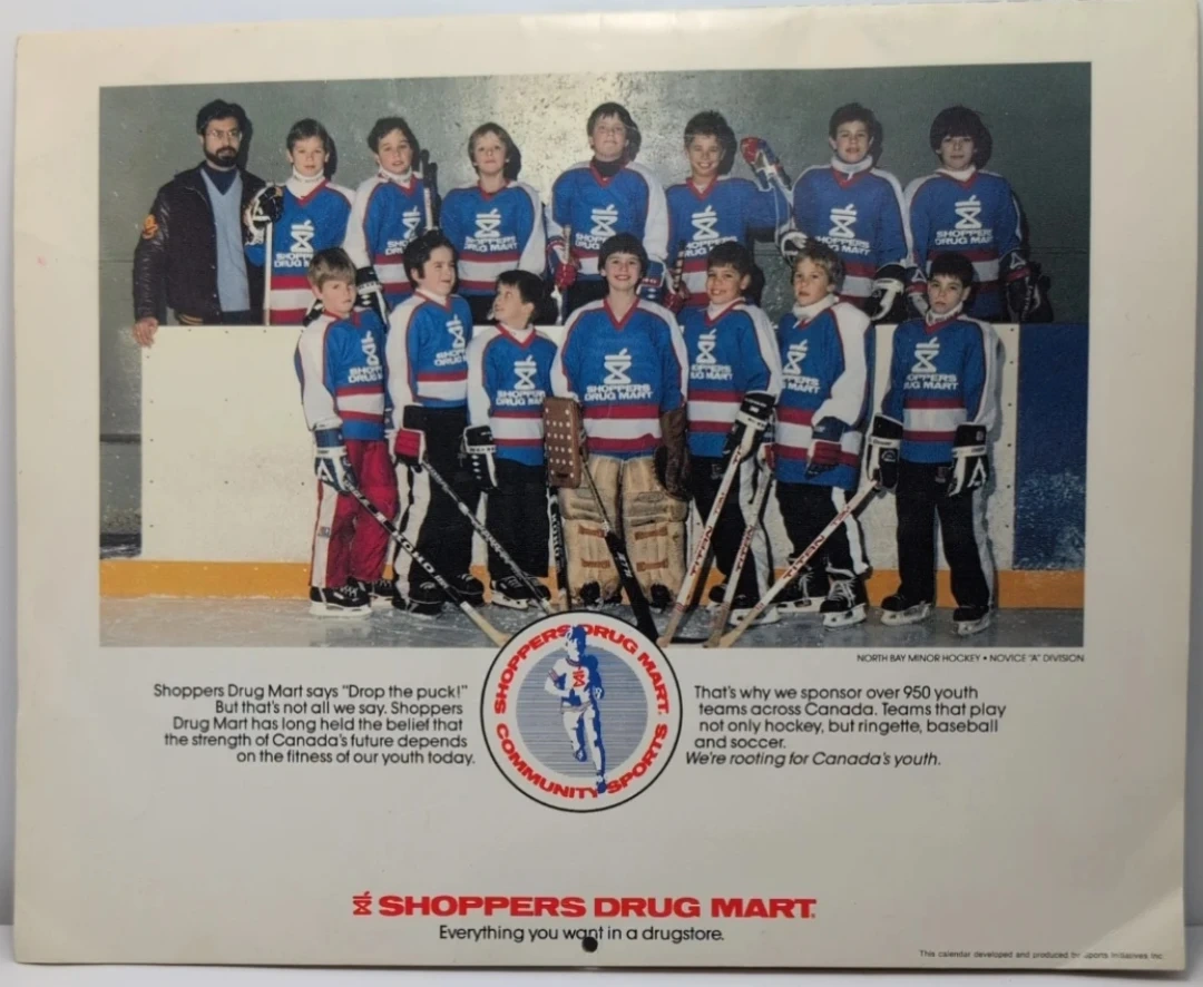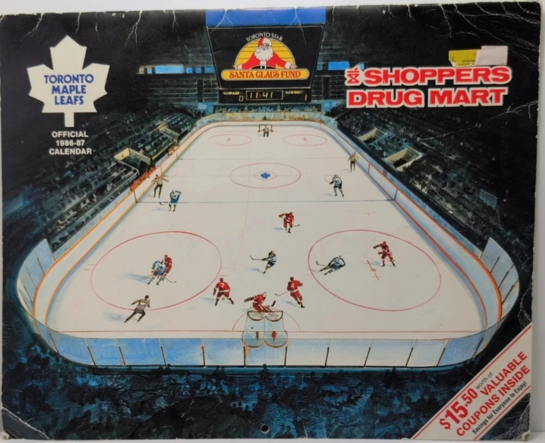 This is the official 1986-87 Toronto Maple Leafs calendar. It features images of players and a hockey rink scene. Inside, you'll find $15.50 worth of valuable coupons from Shoppers Drug Mart. Great for hockey fans!