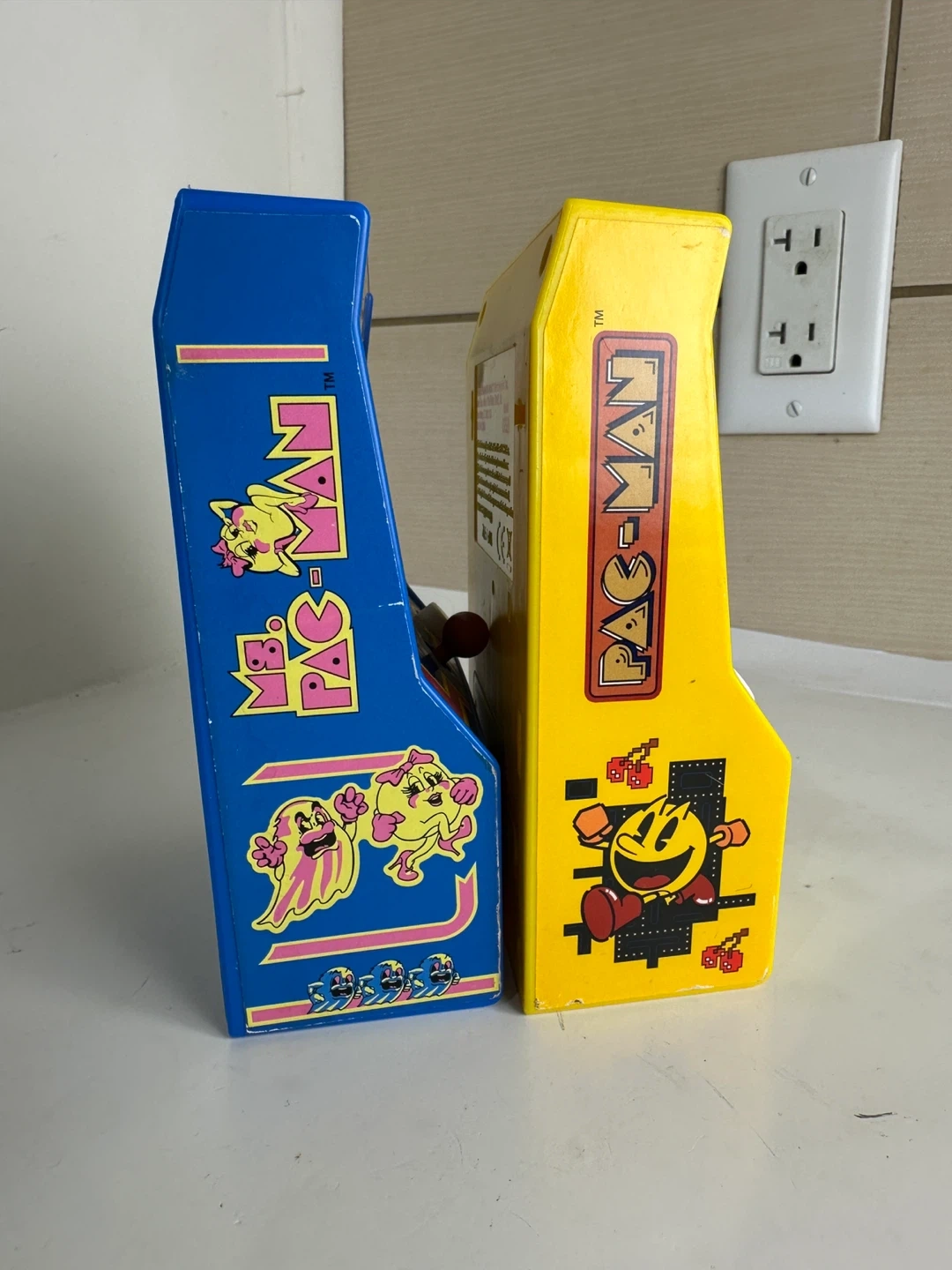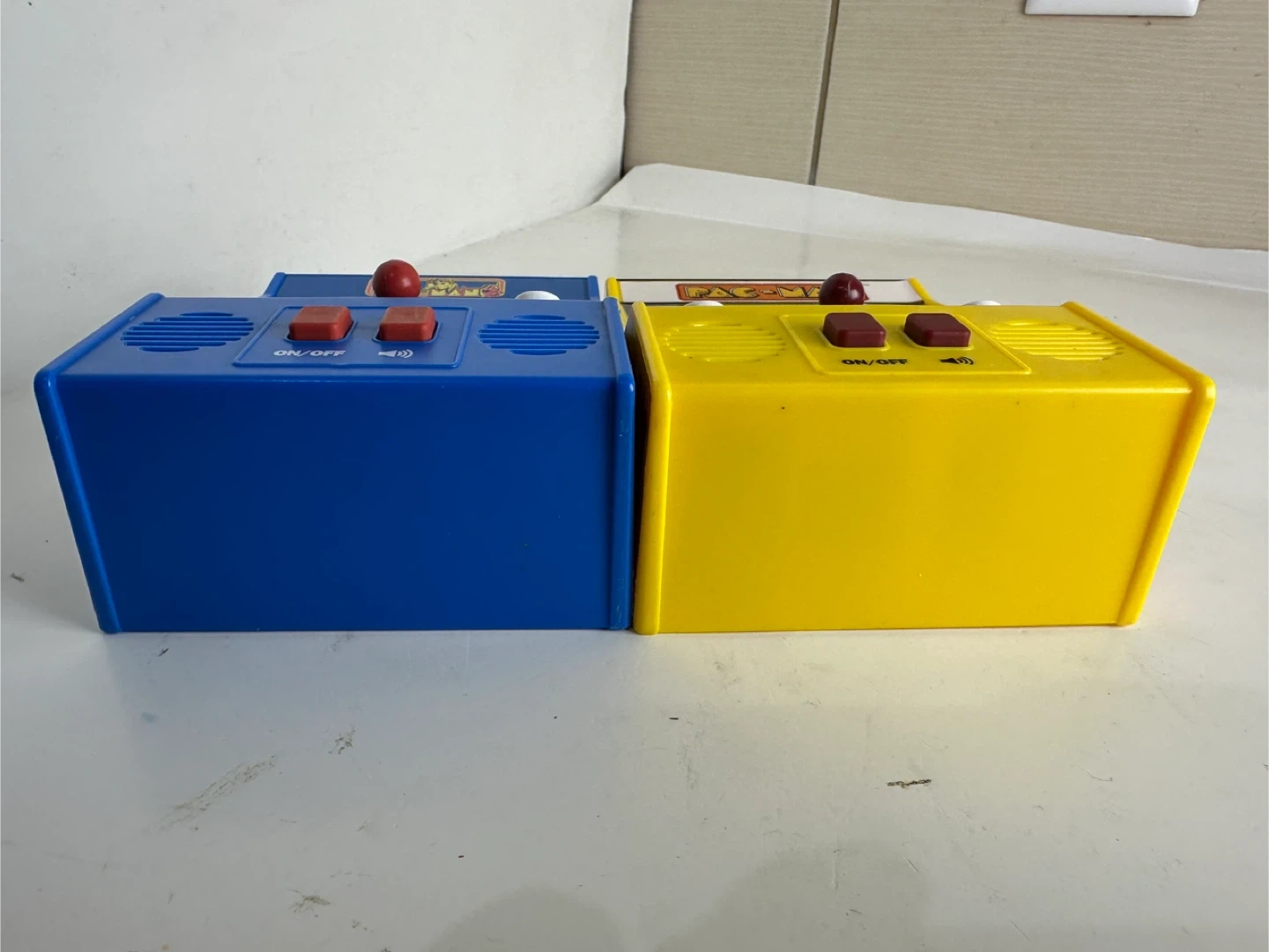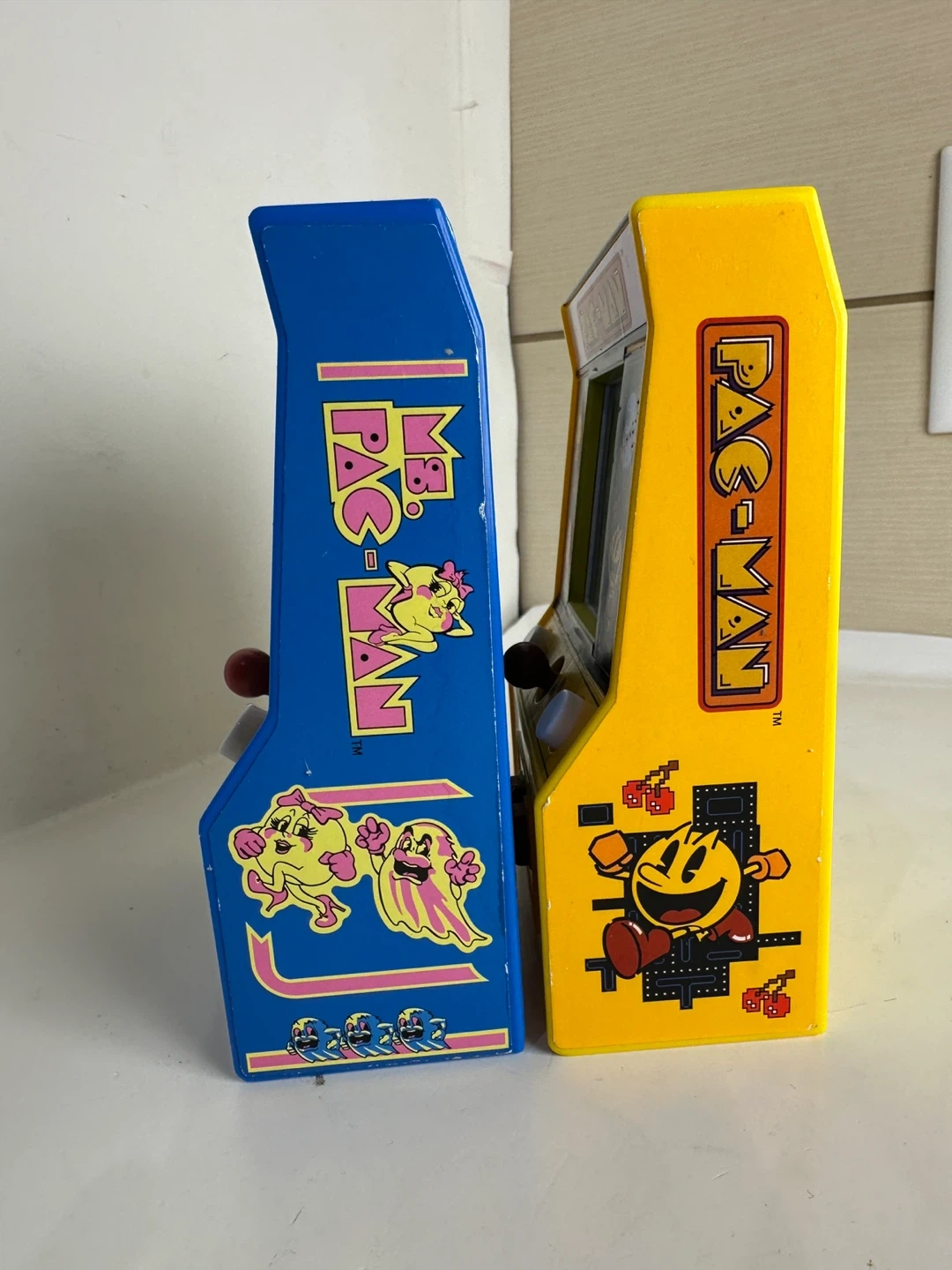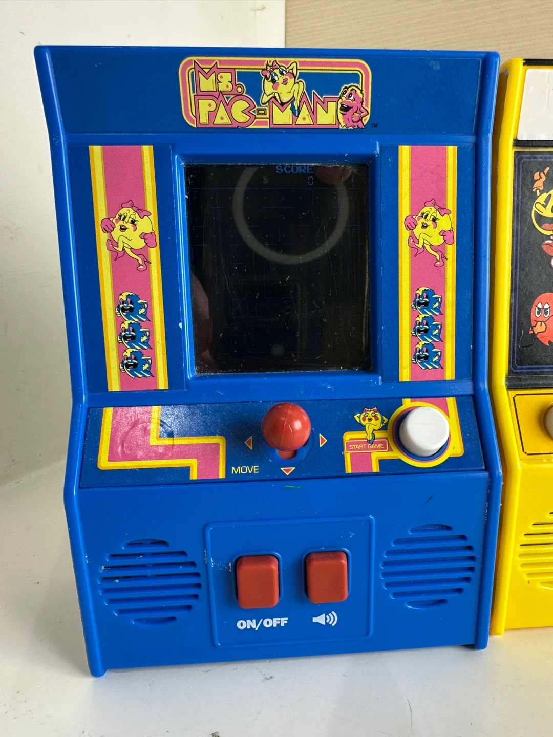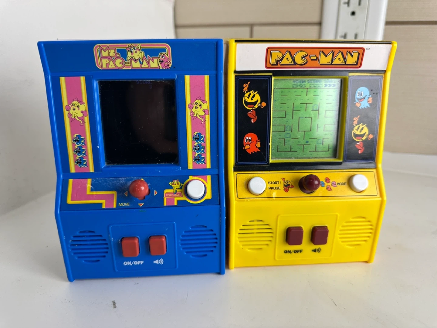 These are Pac-Man handheld electronic game. It's blue with classic Pac-Man characters and graphics. It features a joystick and buttons for gameplay. A fun retro arcade experience!