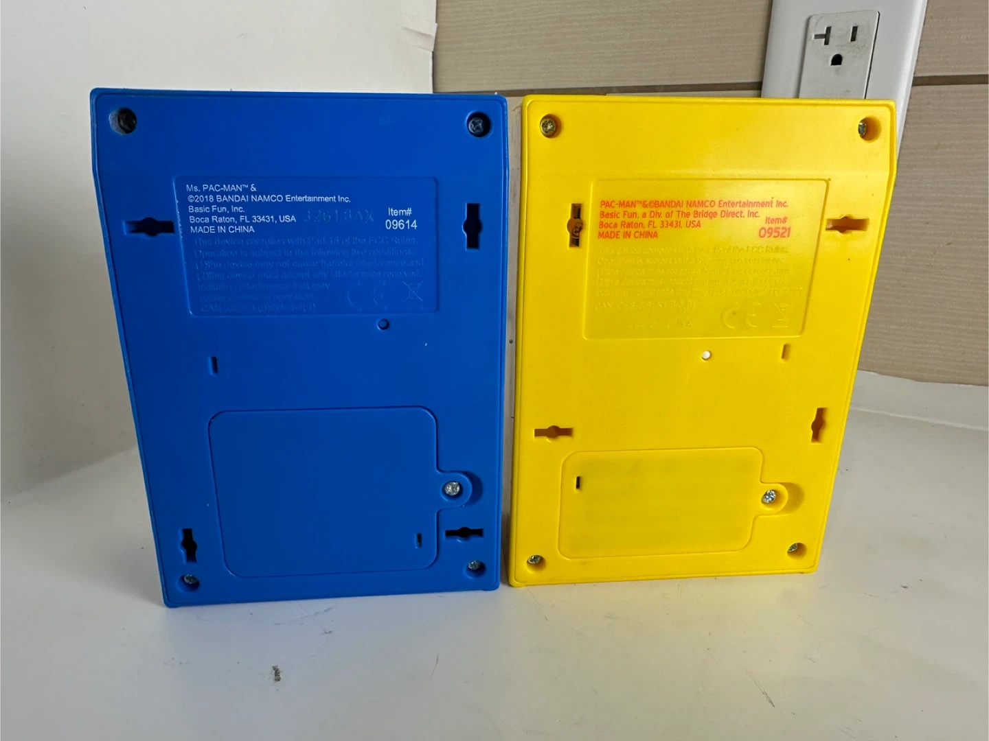 These are Pac-Man handheld electronic game. It's blue with classic Pac-Man characters and graphics. It features a joystick and buttons for gameplay. A fun retro arcade experience!