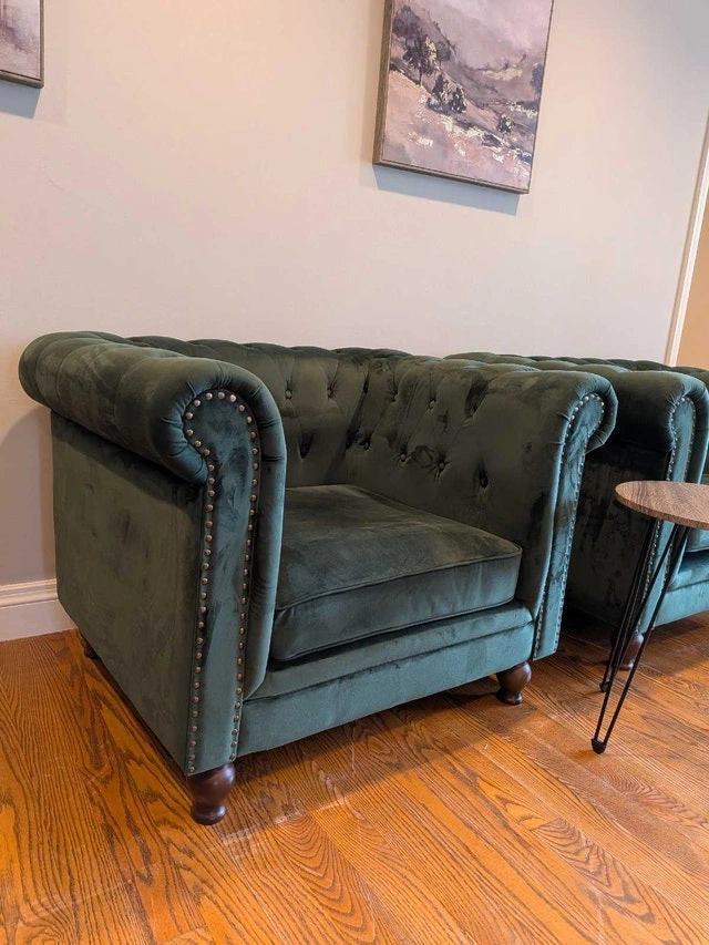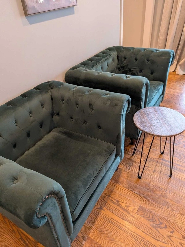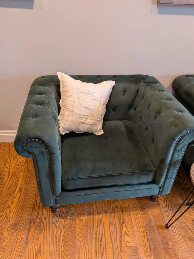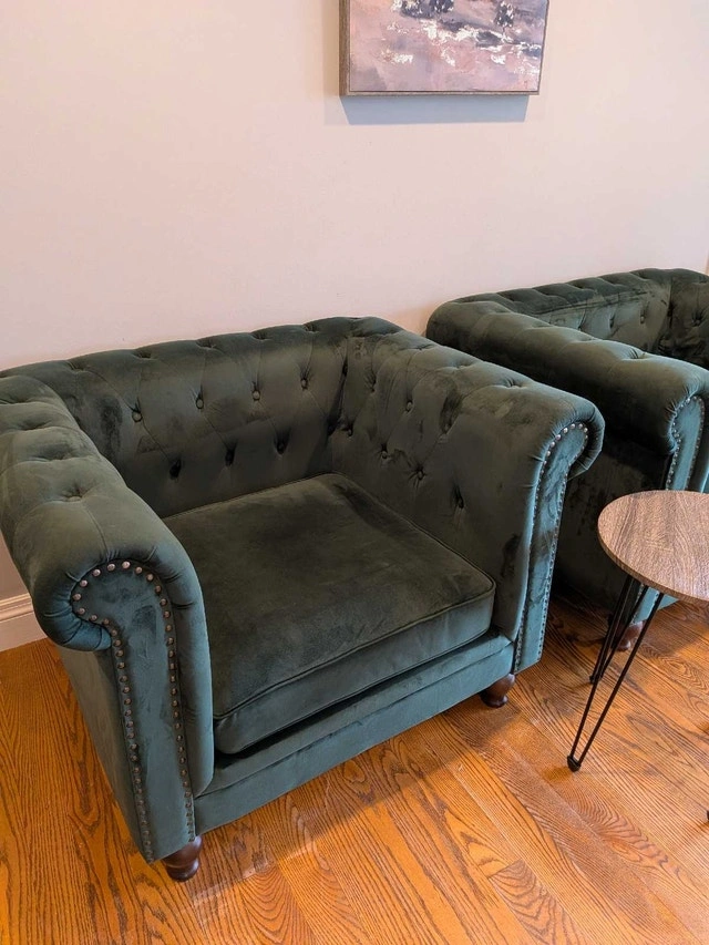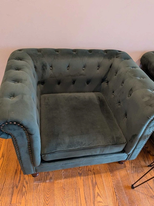 Stunning pair of green tufted armchairs. In very good condition. Velvet feel, soft and comfortable. Dark wood feet, that can be removed by unscrewing them, and can be stored in a zip pouch underneath the chair. Rolled arms, nailhead trim. No tears or holes. Some marks, overall great condition. Owner.