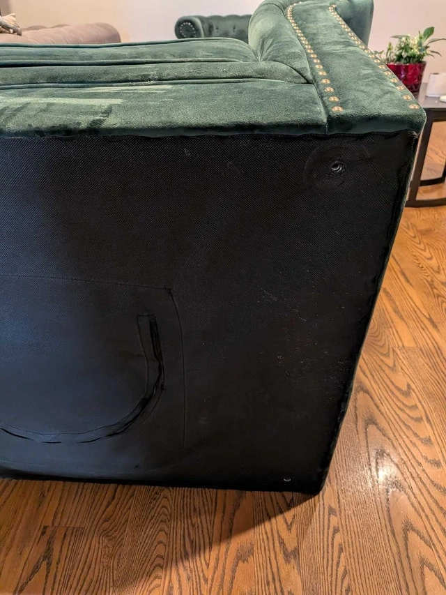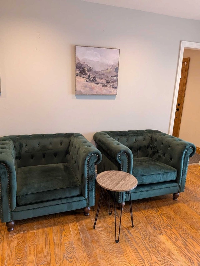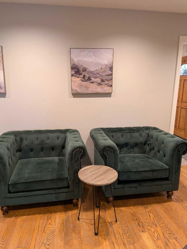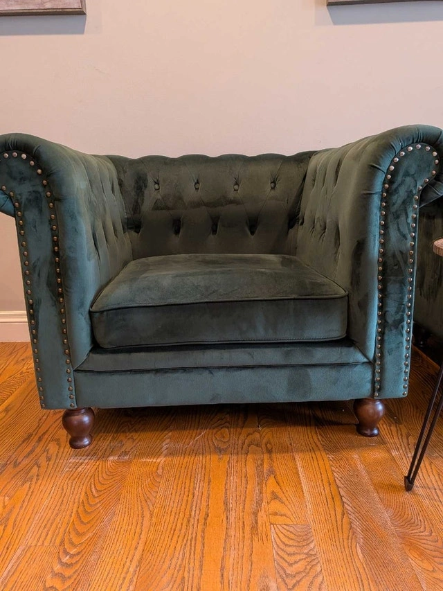 Stunning pair of green tufted armchairs. In very good condition. Velvet feel, soft and comfortable. Dark wood feet, that can be removed by unscrewing them, and can be stored in a zip pouch underneath the chair. Rolled arms, nailhead trim. No tears or holes. Some marks, overall great condition. Owner.