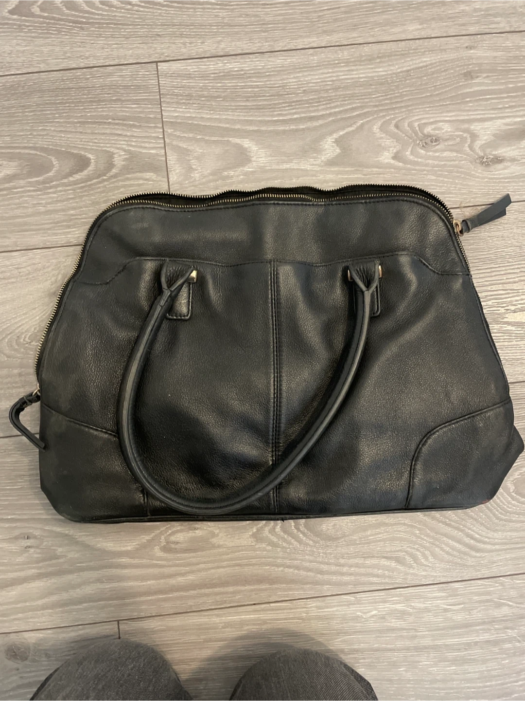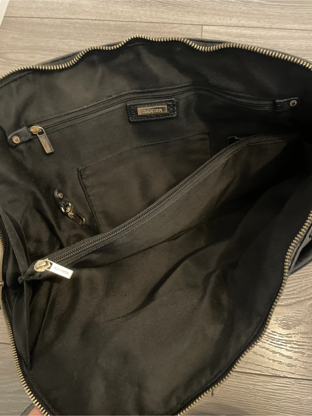 This is a Danier black leather handbag. It features a zippered main compartment and interior pockets. The leather material is durable. 12x17 inches.