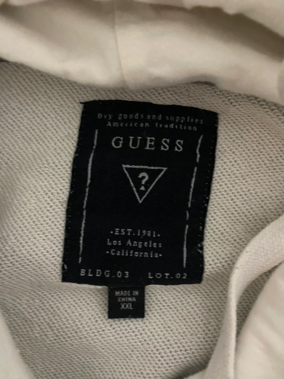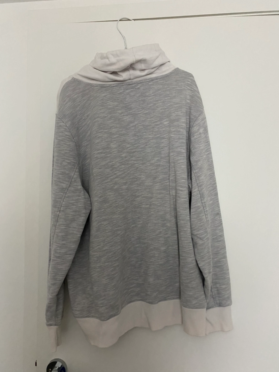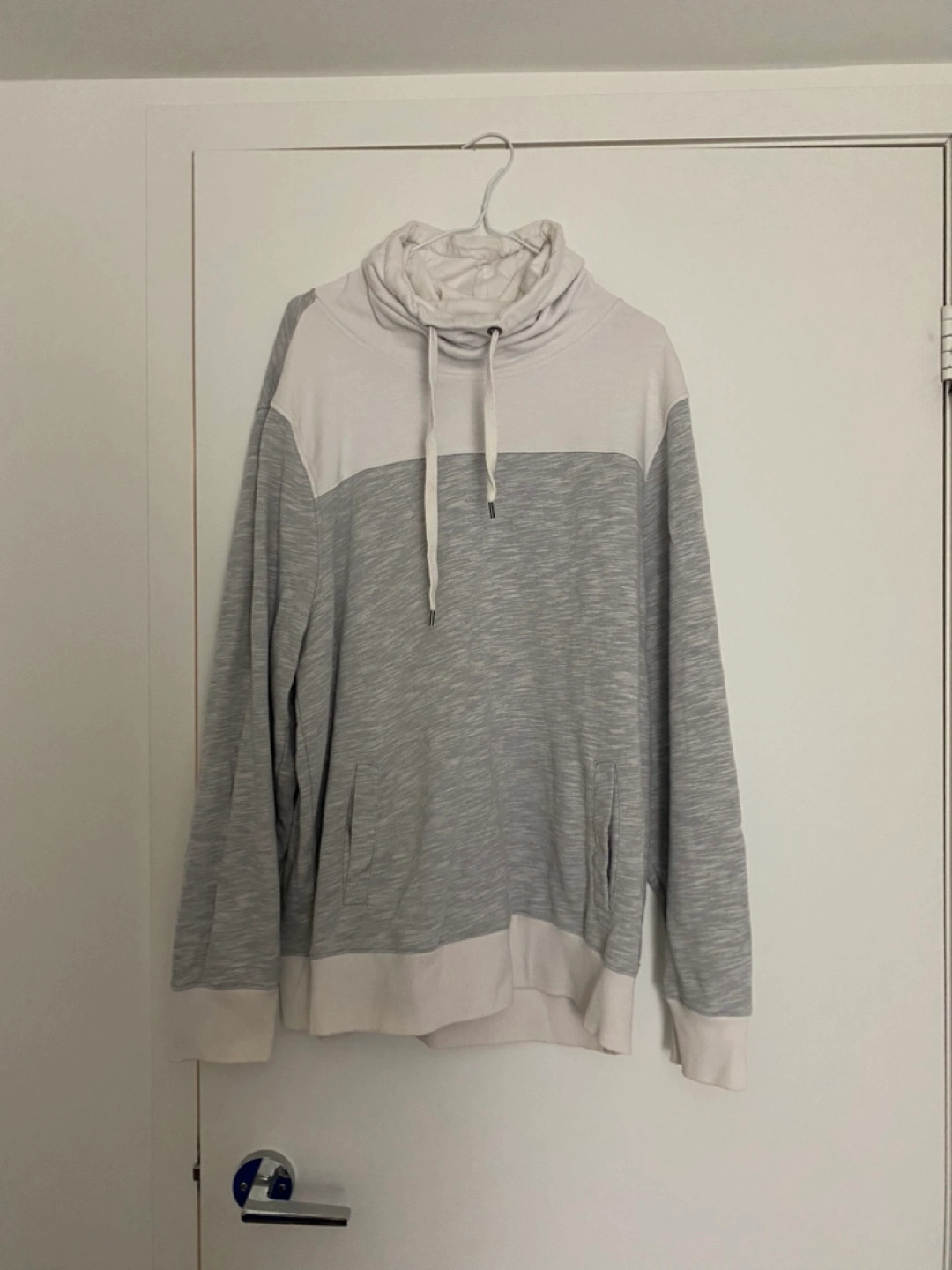 Grey and white colour block hoodie with a high cowl neckline and long sleeves.