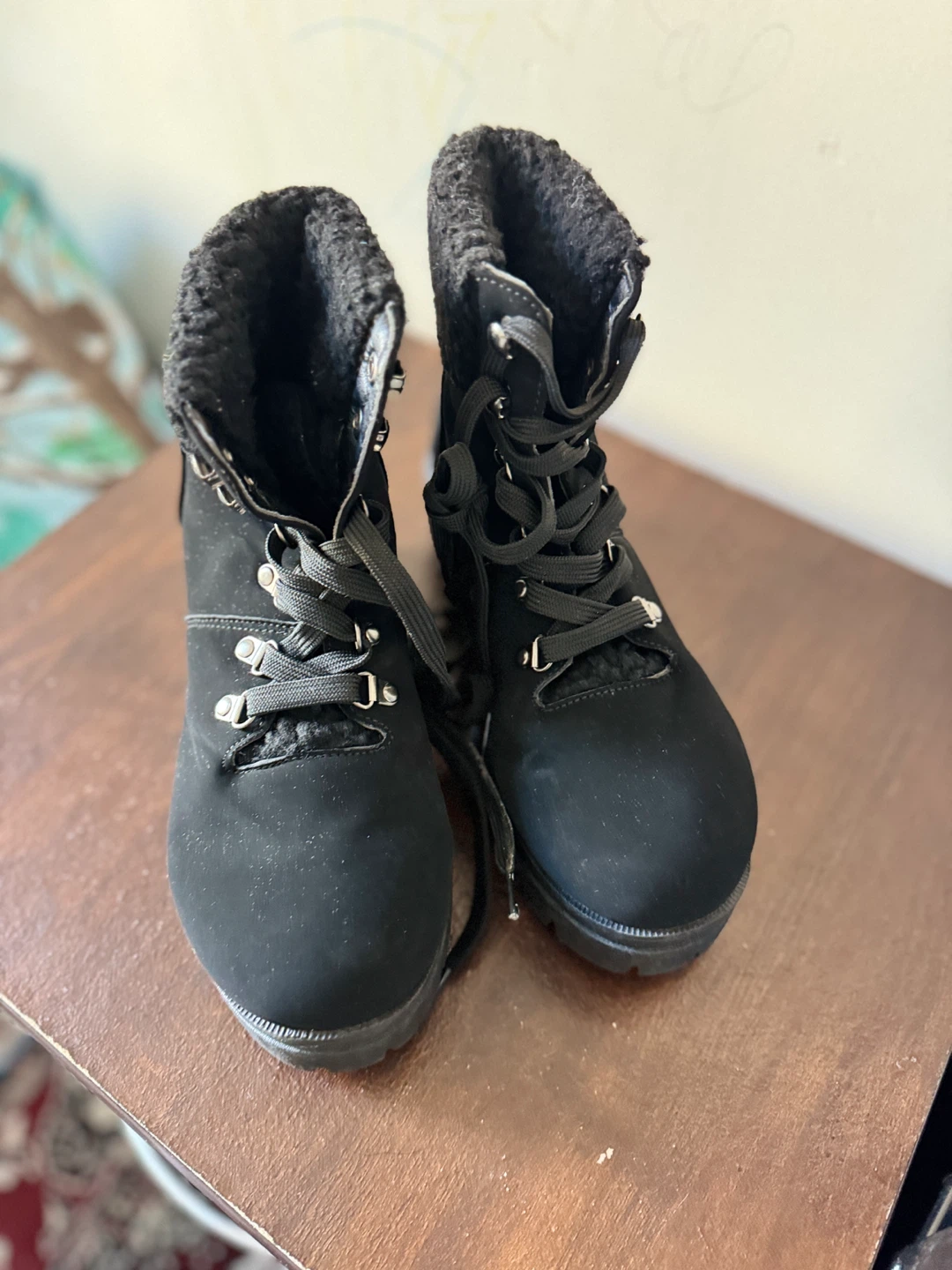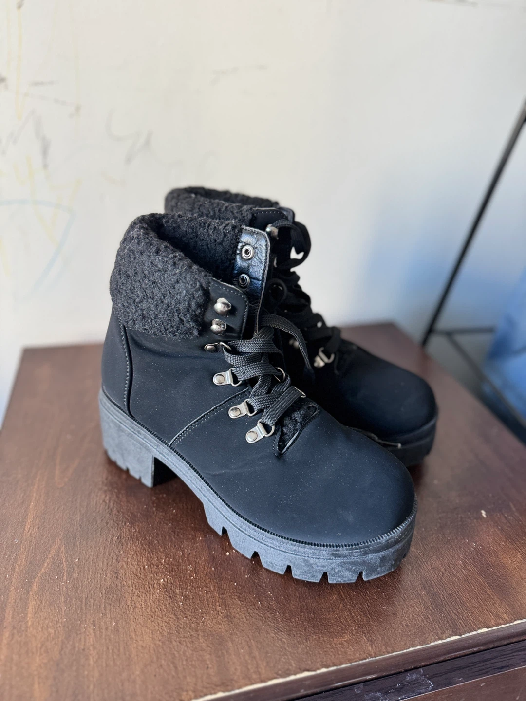 Selling a pair of black ankle boots. They feature a cozy sherpa collar and lace-up design. Great for adding a bit of style to your everyday look!