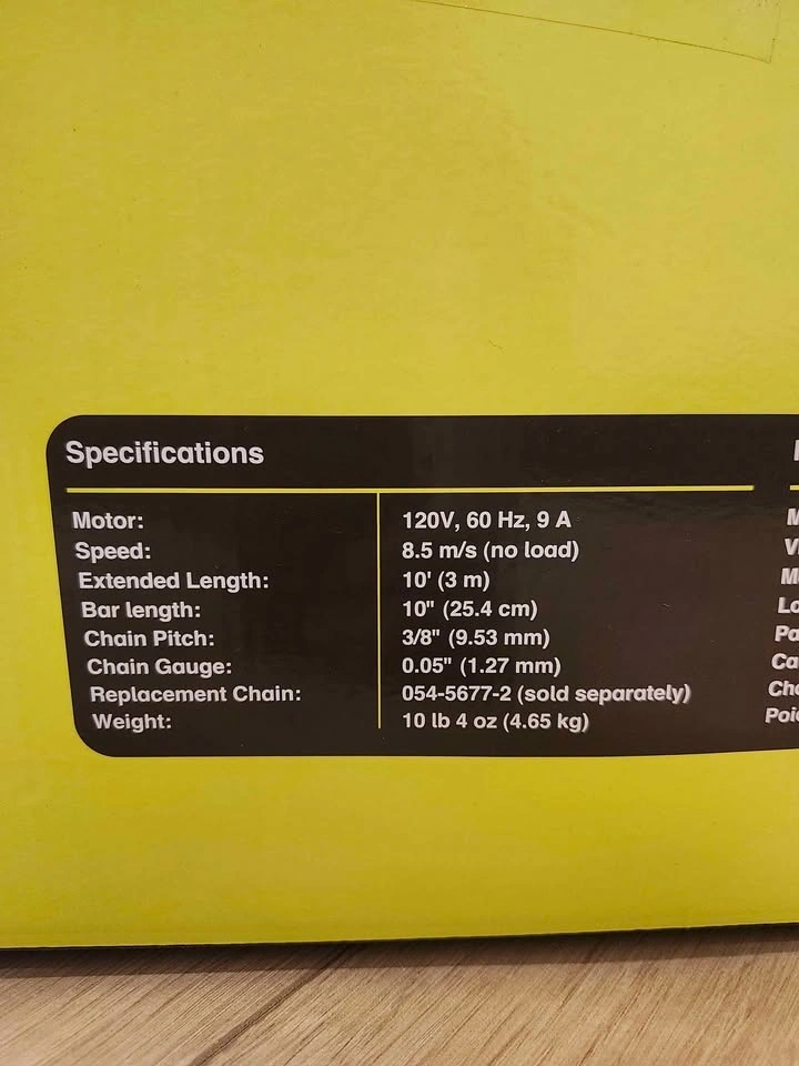 Electric 10 inch chain saw with pole extension. Bought new and never used; passed return window. Includes a free bottle of unopened chainsaw oil (worth $10). Pickup in Georgetown, ON near River Dr.