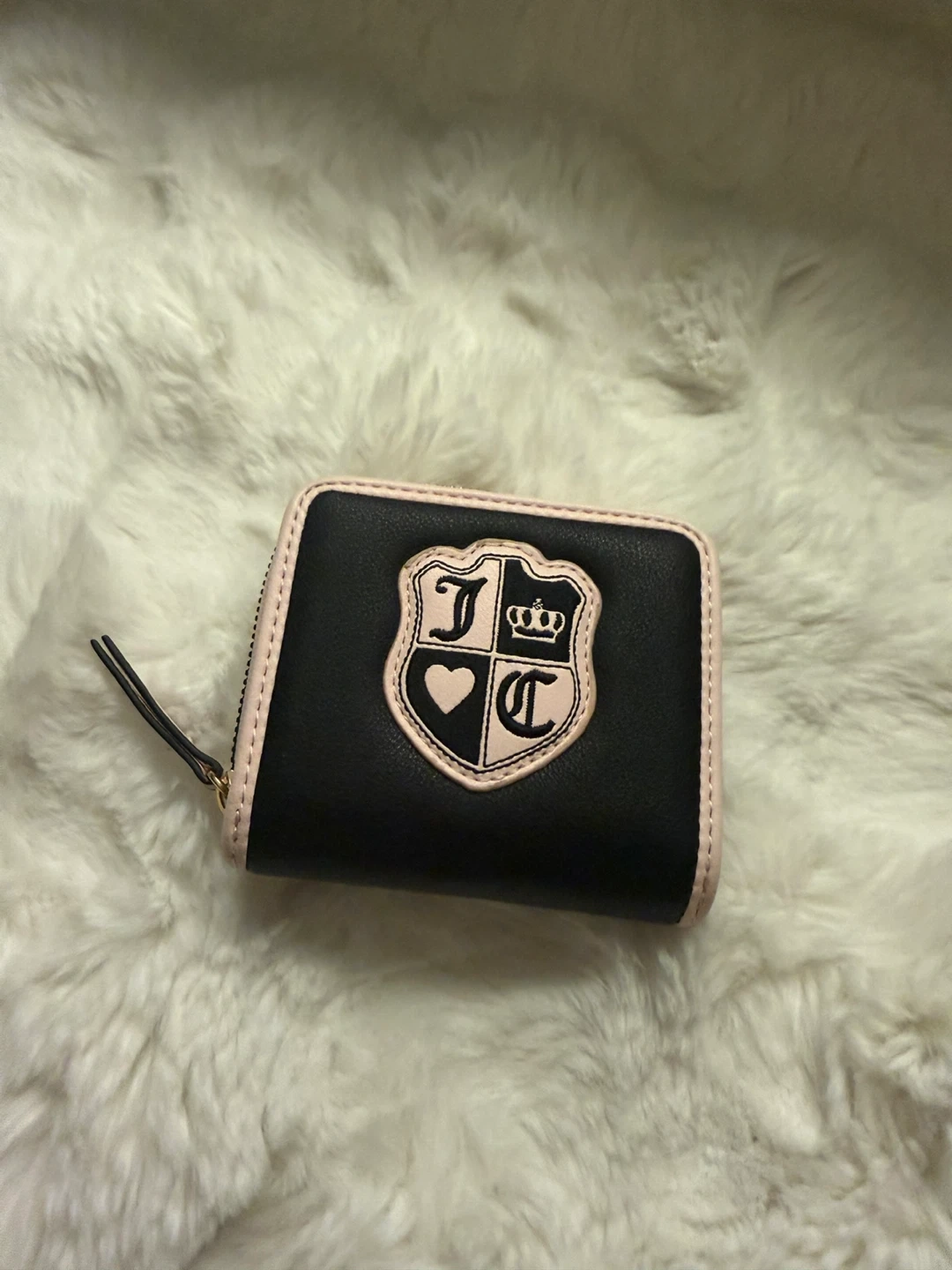 This is a Juicy Couture wallet with a zip-around closure. It's light pink with black accents and a logo lining. Includes multiple card slots and a clear ID window.