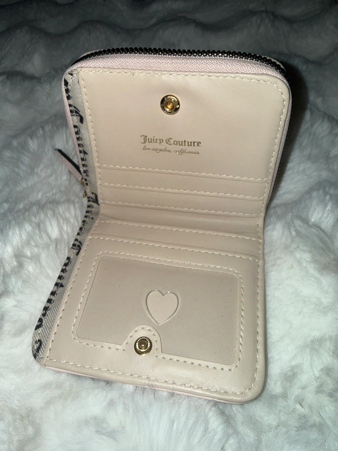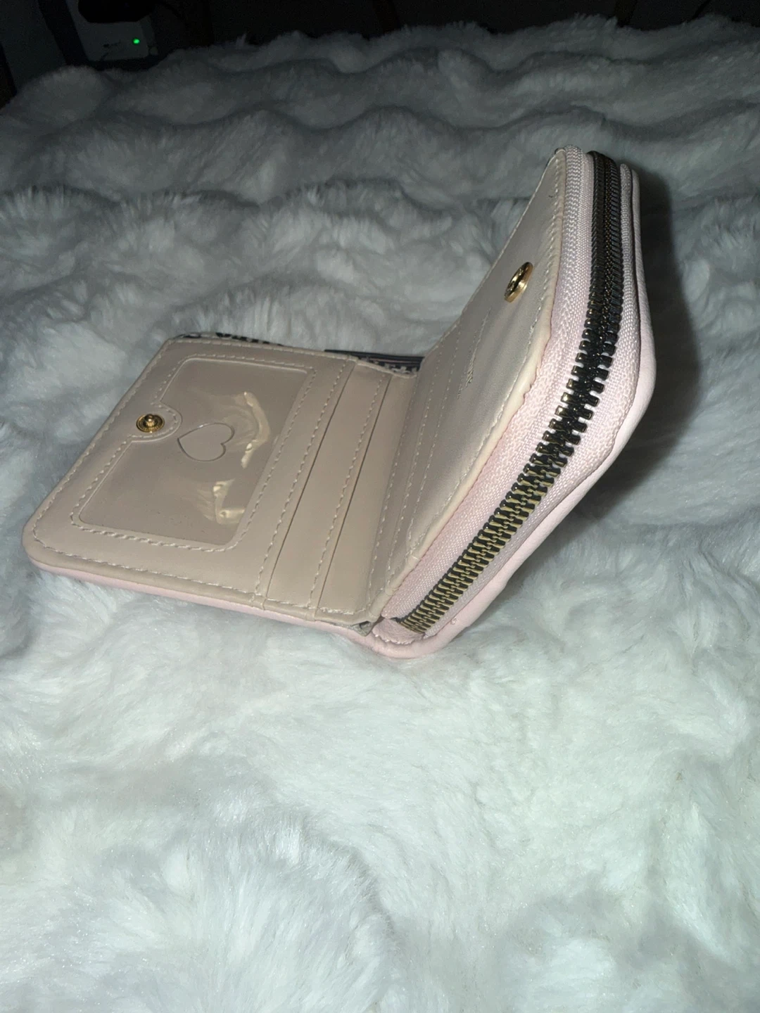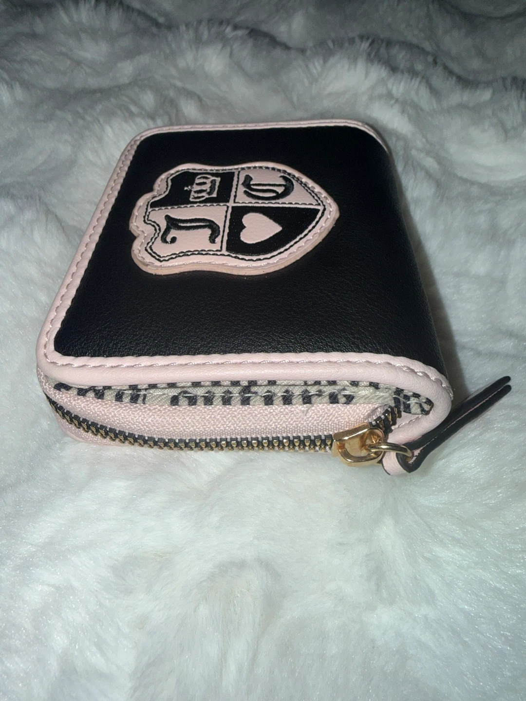 This is a Juicy Couture wallet with a zip-around closure. It's light pink with black accents and a logo lining. Includes multiple card slots and a clear ID window.
