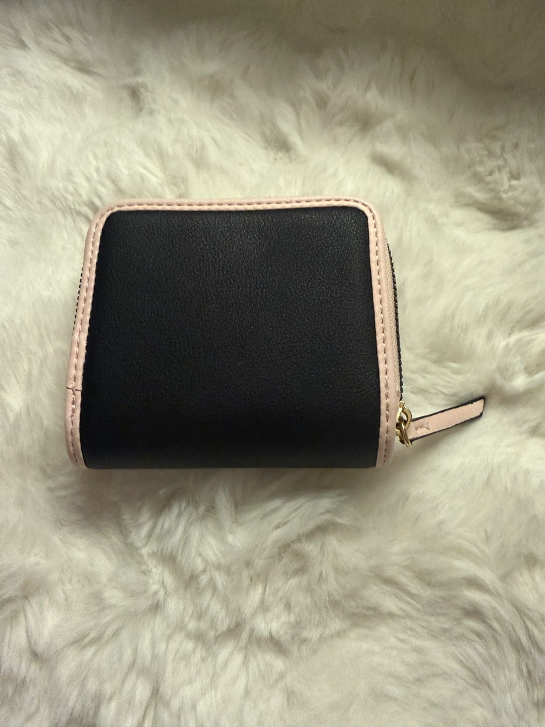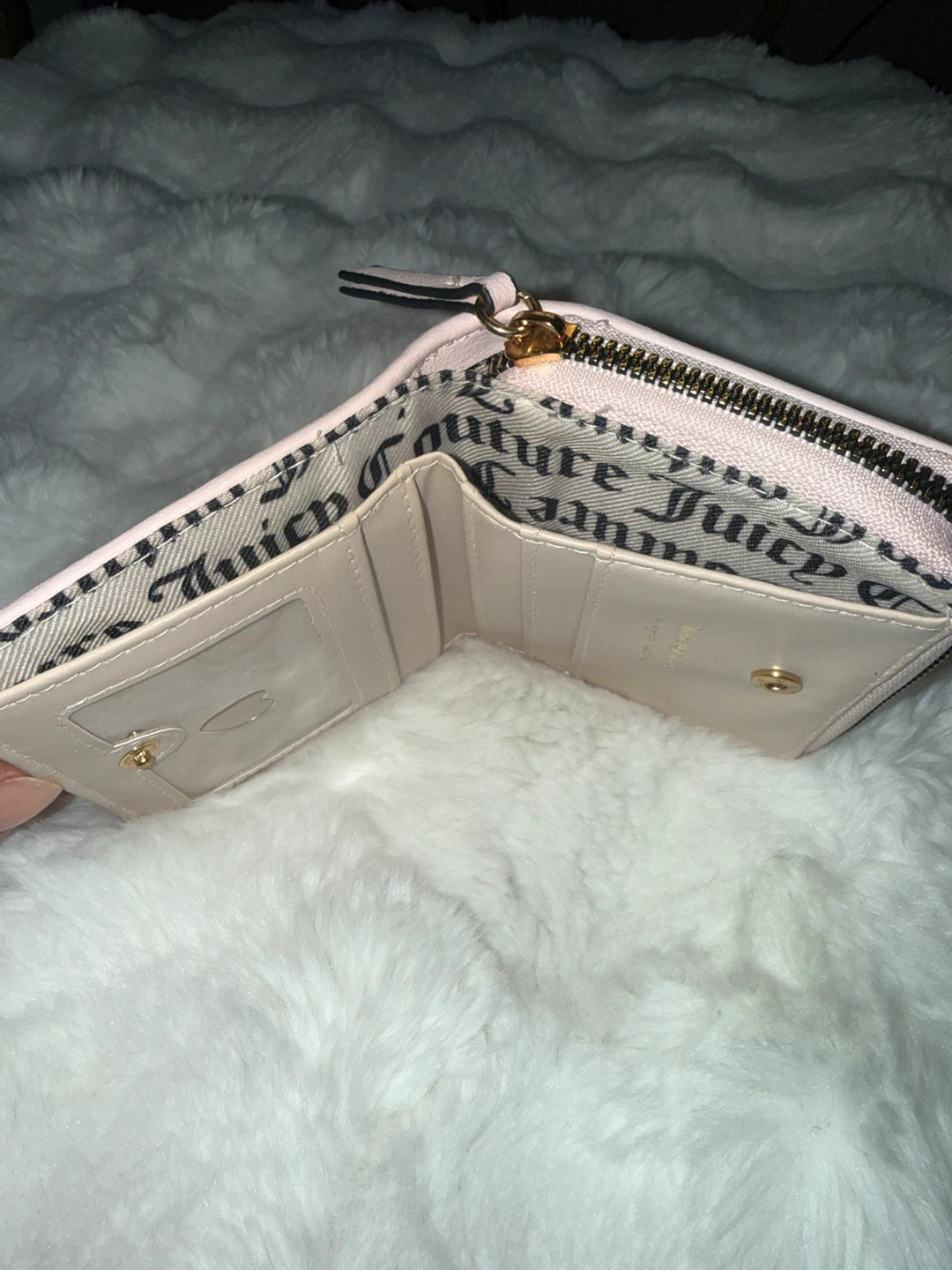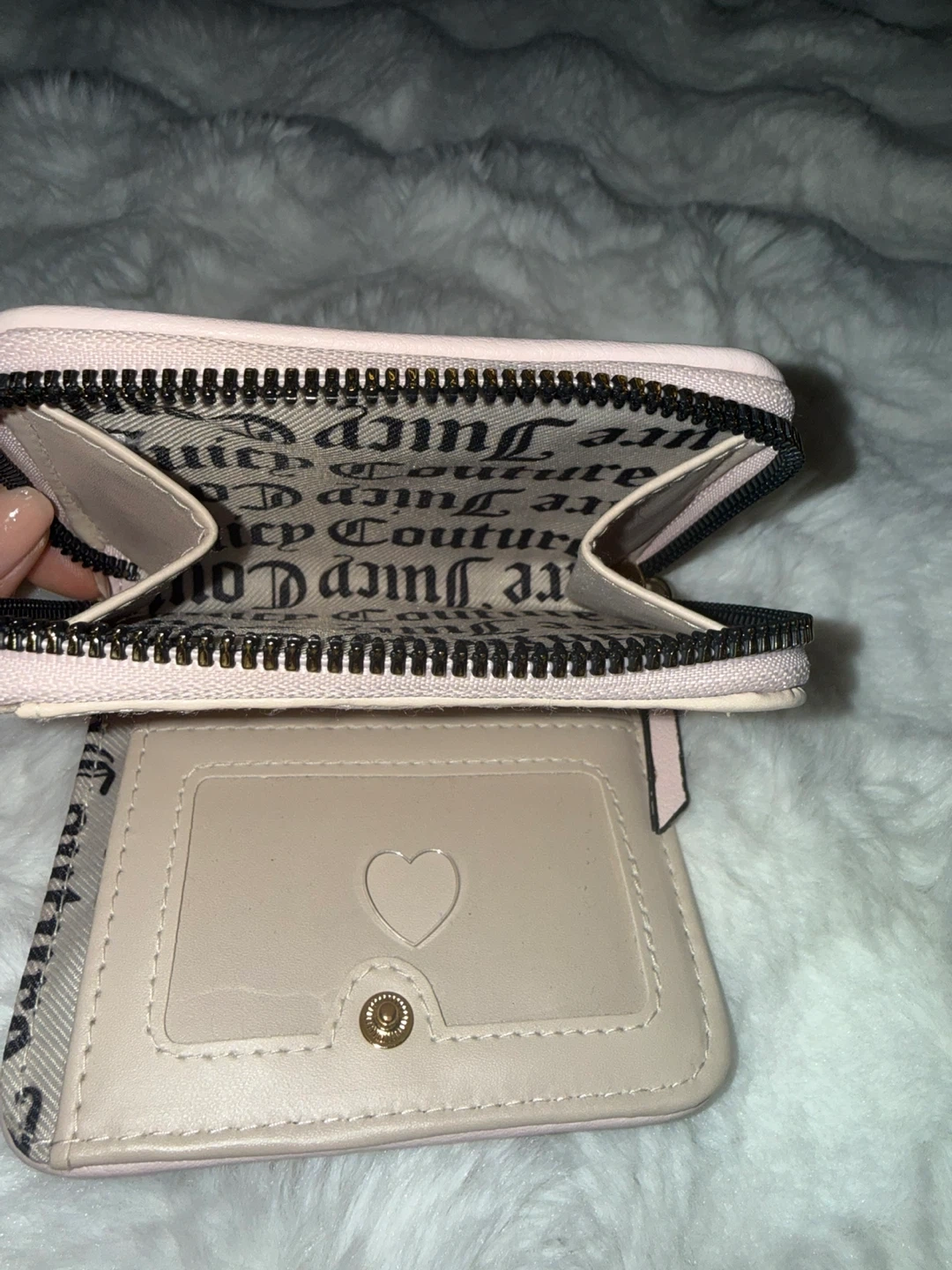 This is a Juicy Couture wallet with a zip-around closure. It's light pink with black accents and a logo lining. Includes multiple card slots and a clear ID window.