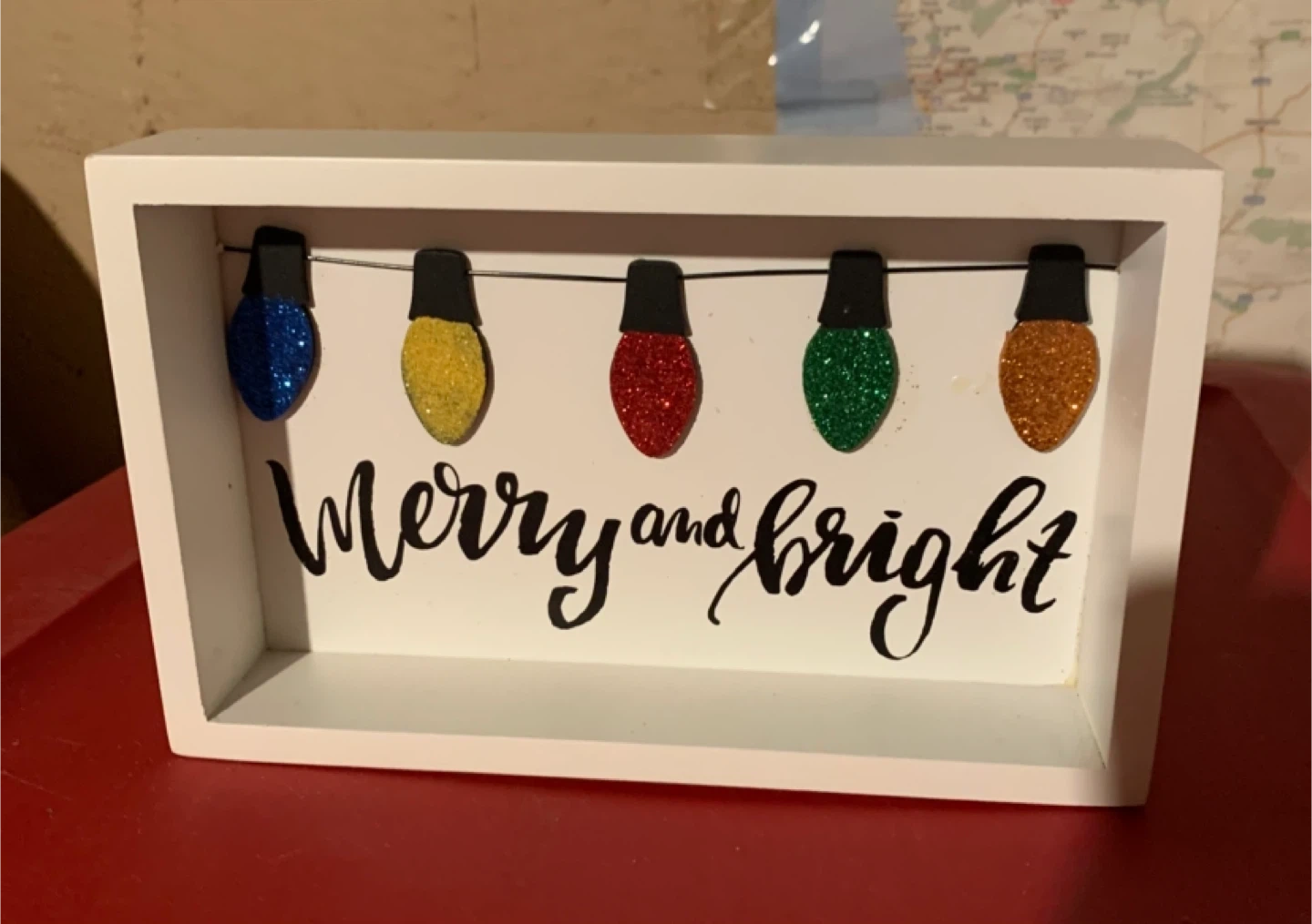 Cute 'Merry and Bright' sign for your holiday decor! It features colorful glittery lights. Perfect for adding a festive touch to any room