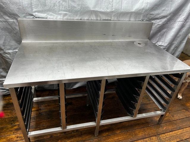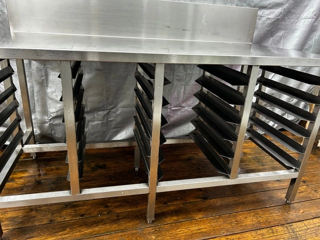 Professional-grade heavy-duty stainless steel work table, perfect for a bakery, restaurant, or commercial kitchen. This unit is designed to hold a heavy convection/combi oven on top while providing massive under-counter storage for baking trays. Features: -High-Capacity Storage: 3-bay design with integrated tray runners (slides). -Heavy Duty: Reinforced stainless steel top with integrated backsplash to keep walls clean. -Construction: Durable, food-grade stainless steel; easy to sanitize and rust-resistant. Condition: Excellent used condition. Structurally sound with no major dents or deep scratches. Runners are straight. Location: Beaverton Pickup only, heavy unit.