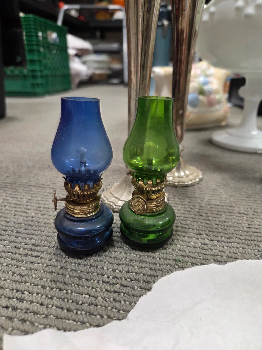 A pair of tiny small oil lamps, one blue and one green. Each has a glass reservoir and a brass-toned wick holder. These would be great for accent lighting or crafting projects.
