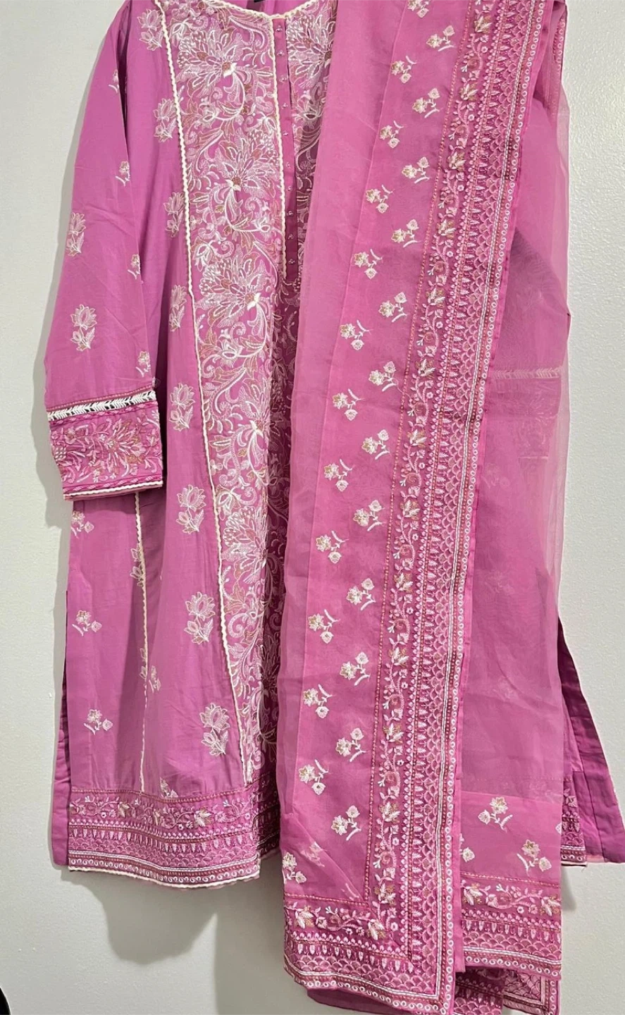This beautiful pink kurti features intricate white embroidery all over, with delicate lace detailing on the sleeves and hem. It comes with a matching pink dupatta that also has detailed embroidery. The fabric appears to be cotton or a cotton blend.