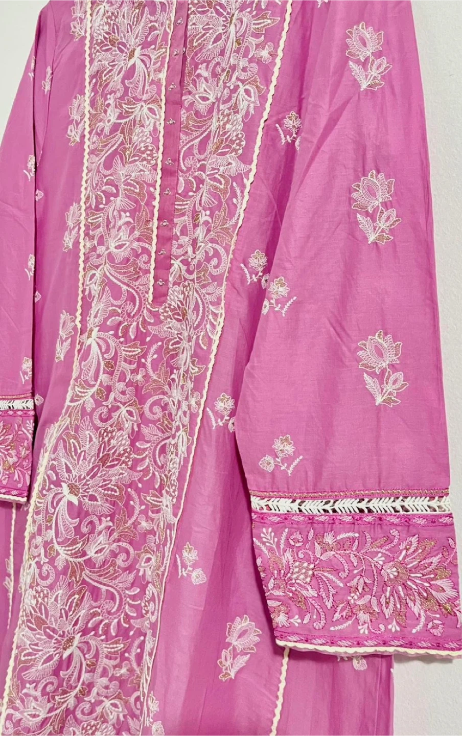 This beautiful pink kurti features intricate white embroidery all over, with delicate lace detailing on the sleeves and hem. It comes with a matching pink dupatta that also has detailed embroidery. The fabric appears to be cotton or a cotton blend.