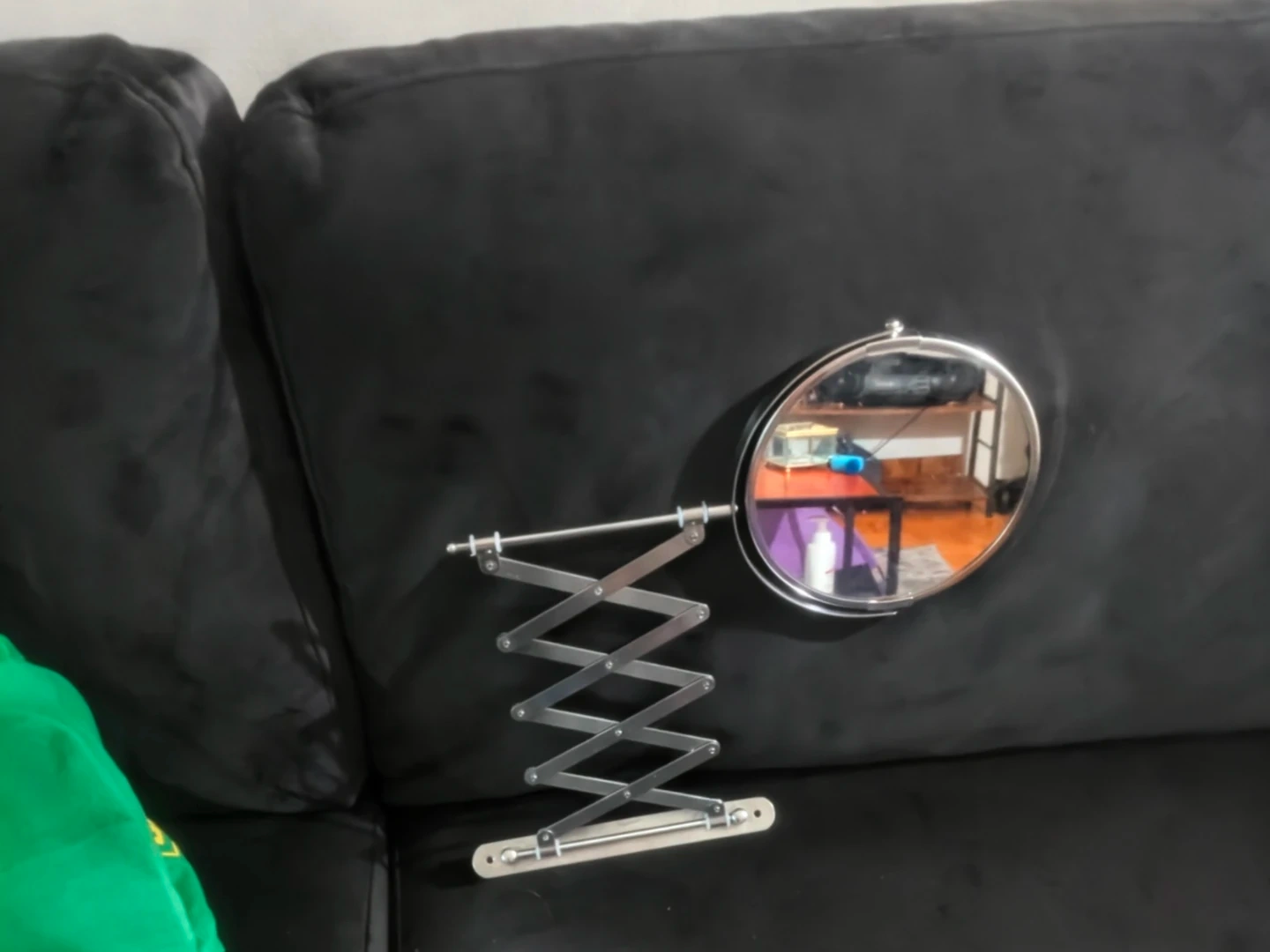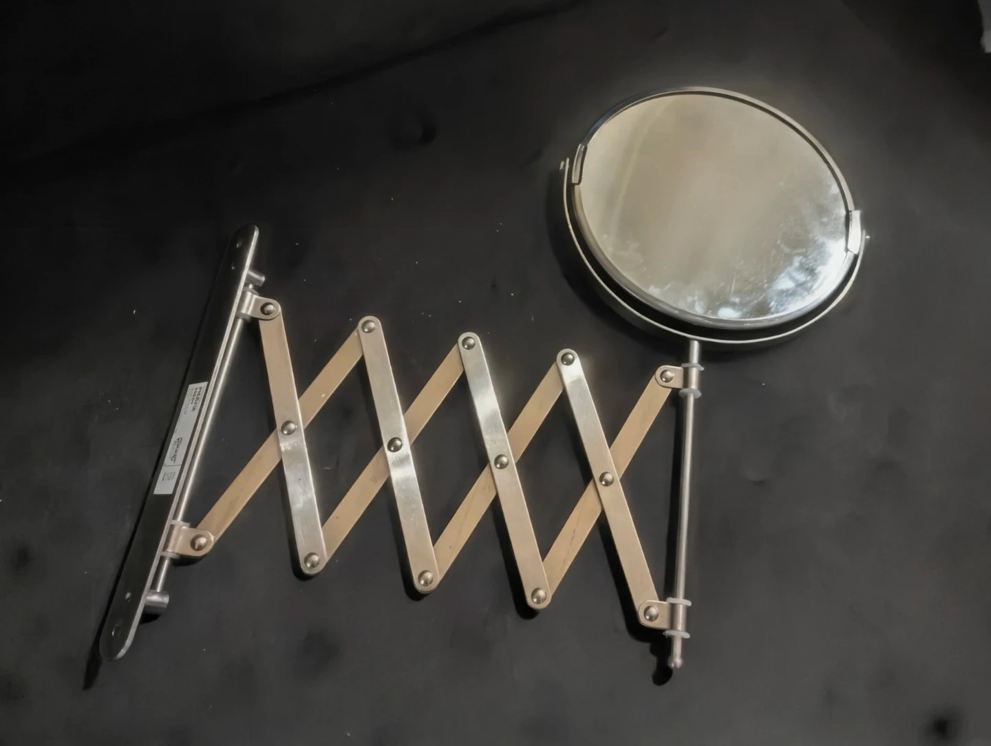 This is a wall-mounted mirror with an extendable arm. It's made of metal and features a round mirror head. The arm allows for adjustable positioning. This mirror is useful for applying makeup or shaving.