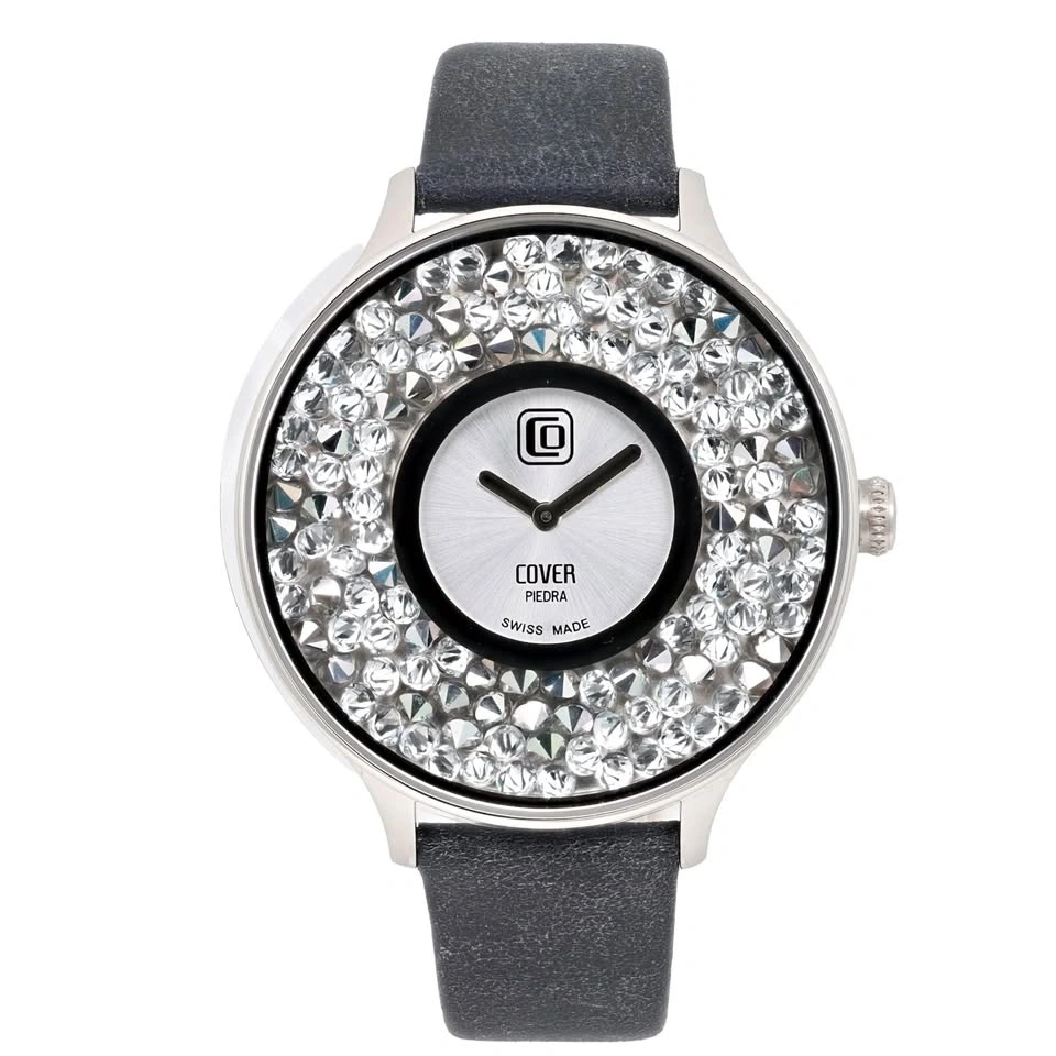 This pre-owned gem has never been worn but may display minor scratches from store handling. The Cover Piedra 42mm Steel Silver Dial & Grey Band Unisex Quartz Watch (CO158.02) is a Swiss-made creation that embodies a minimalist and sophisticated charm. Its stone-covered bezel and a dial devoid of traditional hour markers beautifully reflect the essence of its "Piedra" theme. Featuring a reliable Swiss Quartz movement (ETA caliber 902.002), this watch boasts a case with a 42mm diameter and a sleek 9mm thickness, crafted from polished stainless steel. The silver analog display, elegantly free of hour marks, often sparkles with Swarovski crystal accents. Complementing its aesthetic is a 16mm wide grey faux leather strap with a secure pin buckle closure. With a water resistance of 5 ATM (up to 50 meters/165 feet), this timepiece is as functional as it is stylish.