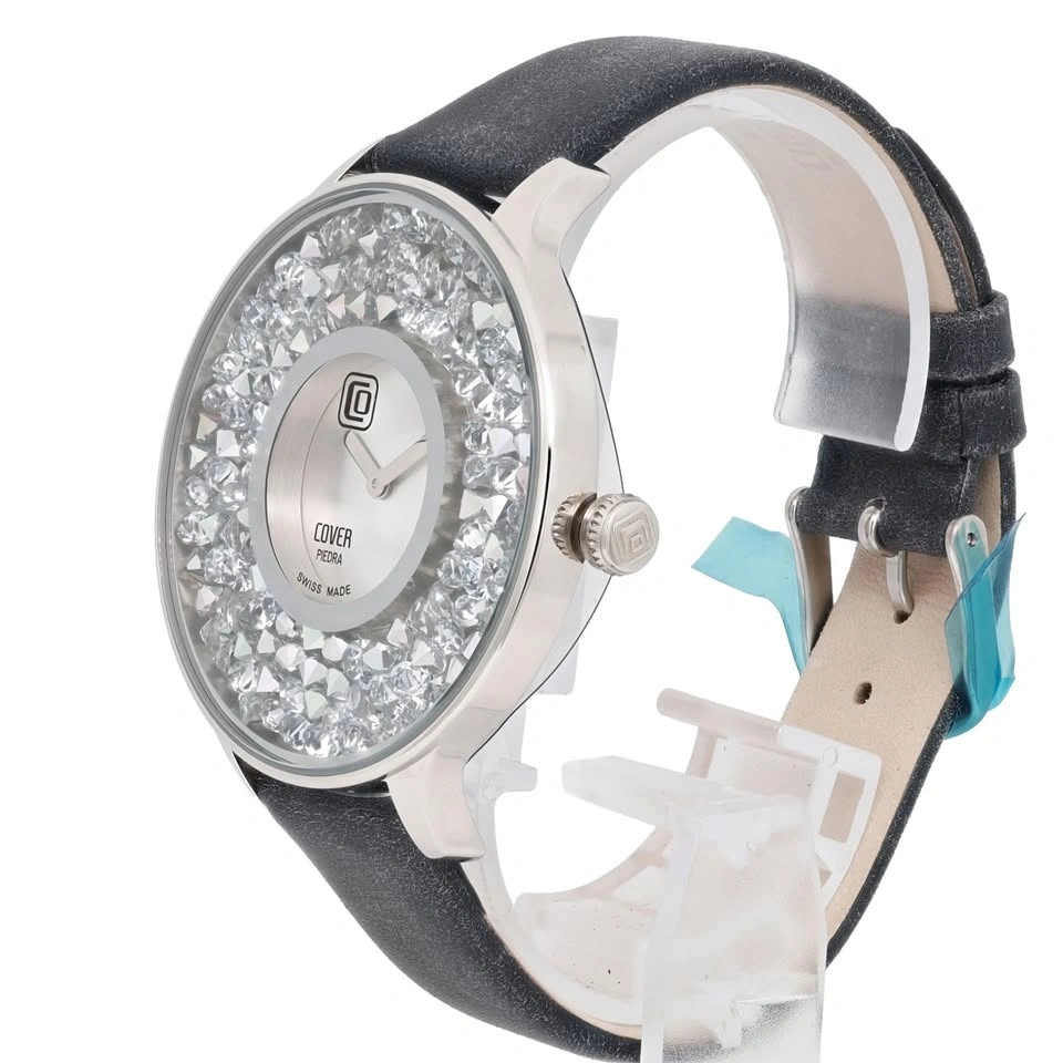 This pre-owned gem has never been worn but may display minor scratches from store handling. The Cover Piedra 42mm Steel Silver Dial & Grey Band Unisex Quartz Watch (CO158.02) is a Swiss-made creation that embodies a minimalist and sophisticated charm. Its stone-covered bezel and a dial devoid of traditional hour markers beautifully reflect the essence of its "Piedra" theme. Featuring a reliable Swiss Quartz movement (ETA caliber 902.002), this watch boasts a case with a 42mm diameter and a sleek 9mm thickness, crafted from polished stainless steel. The silver analog display, elegantly free of hour marks, often sparkles with Swarovski crystal accents. Complementing its aesthetic is a 16mm wide grey faux leather strap with a secure pin buckle closure. With a water resistance of 5 ATM (up to 50 meters/165 feet), this timepiece is as functional as it is stylish.