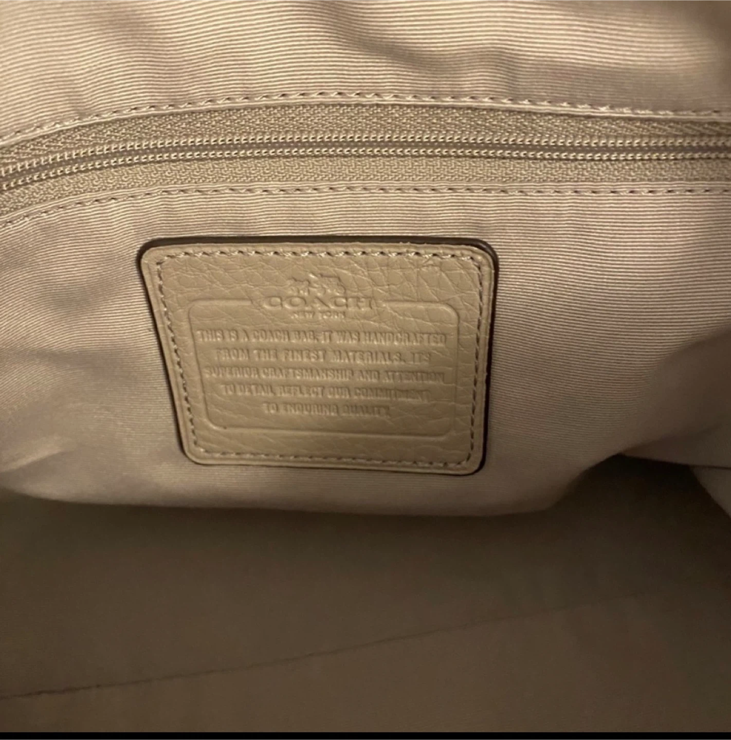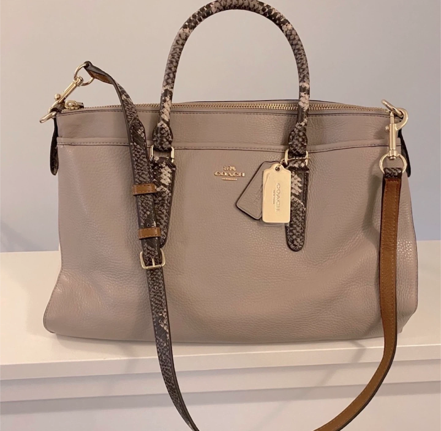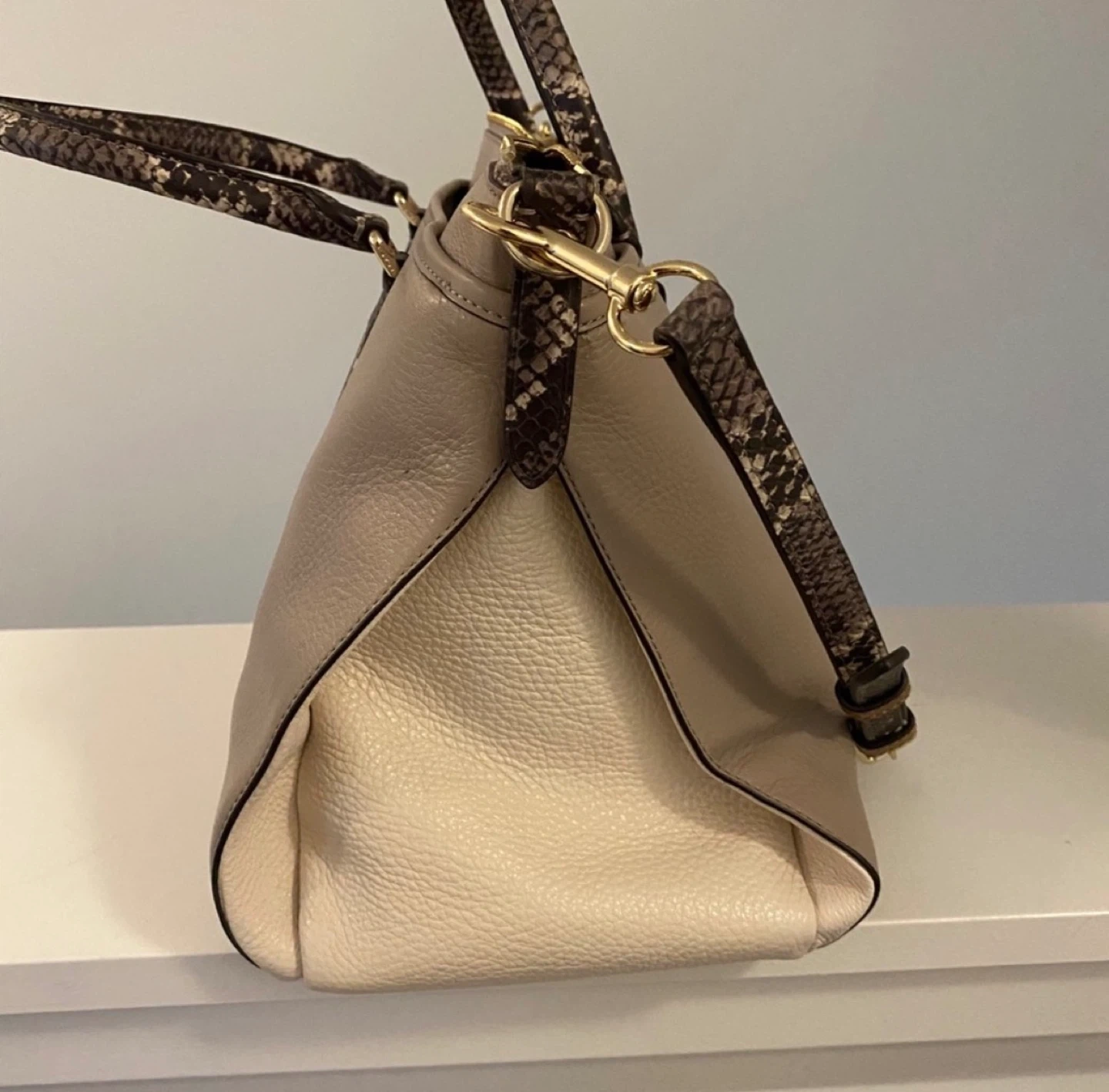 This is a Coach satchel bag crafted from fine leather with a snakeskin accent on the handles and strap. It has a zip-top closure and a detachable crossbody strap. A stylish everyday bag! medium size
