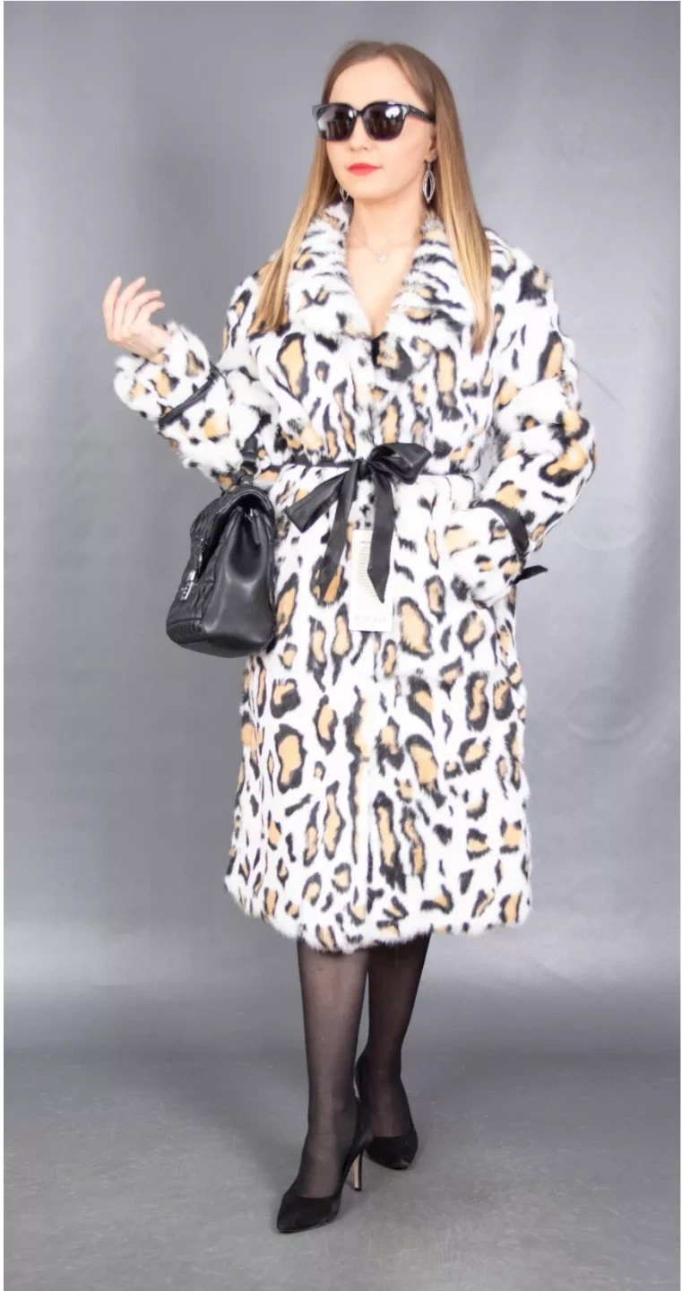 Stylish leopard print Lapin fur coat with a black ribbon tie. It's made from a soft, plush material. A great statement piece for cooler weather!
