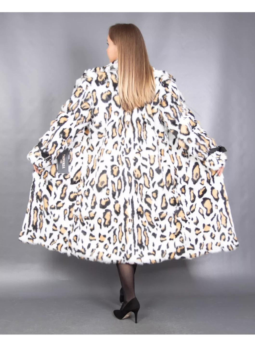 Stylish leopard print Lapin fur coat with a black ribbon tie. It's made from a soft, plush material. A great statement piece for cooler weather!
