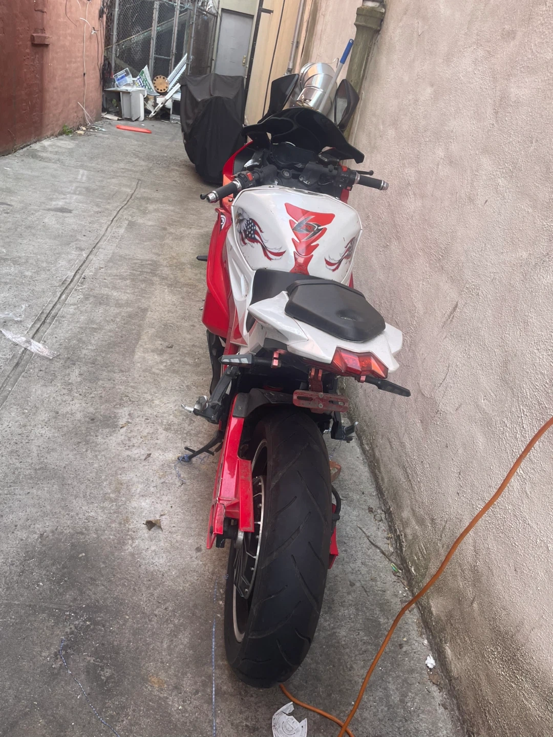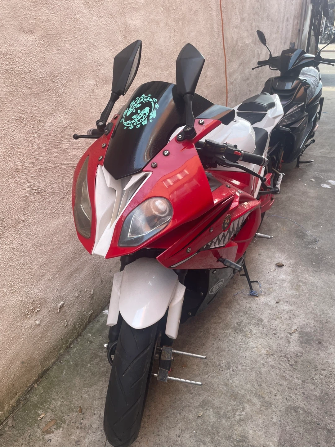 This is a red and white sport motorcycle. It has a sleek design and features a shark mouth graphic on the fairings. The seat is black and the wheels are black with red accents. It's a stylish ride! I have receipts and everything works perfectly