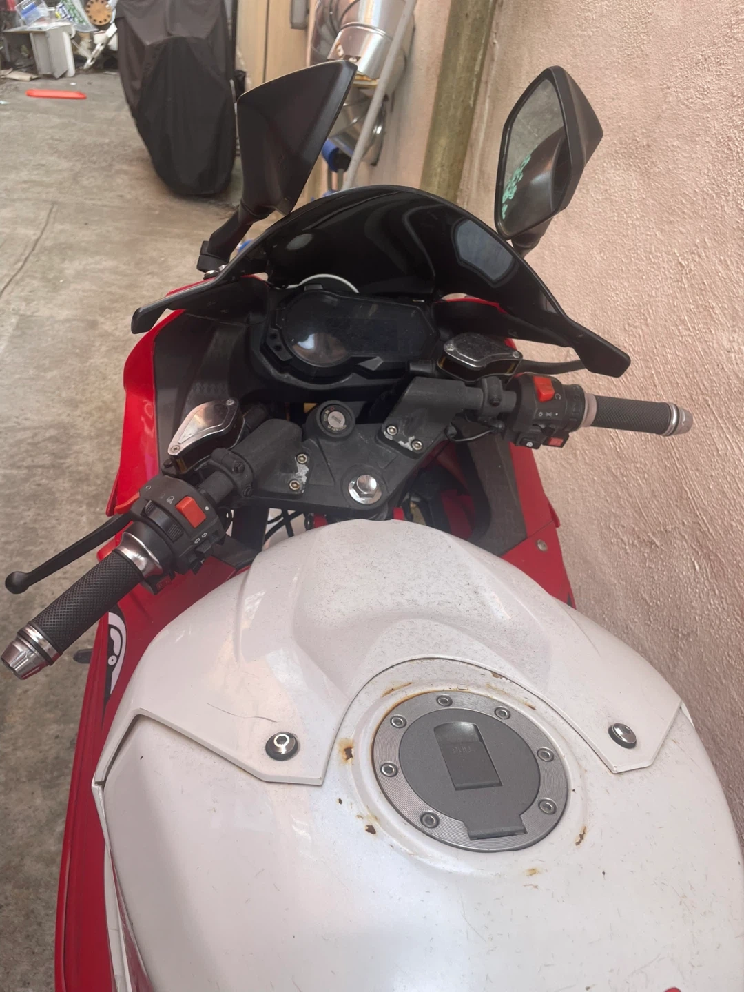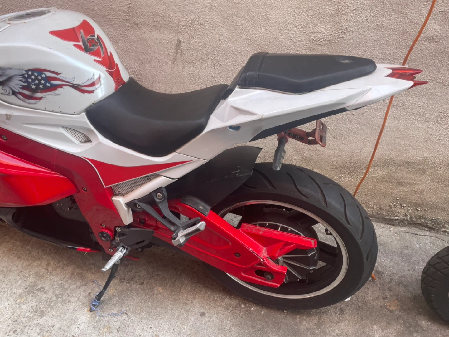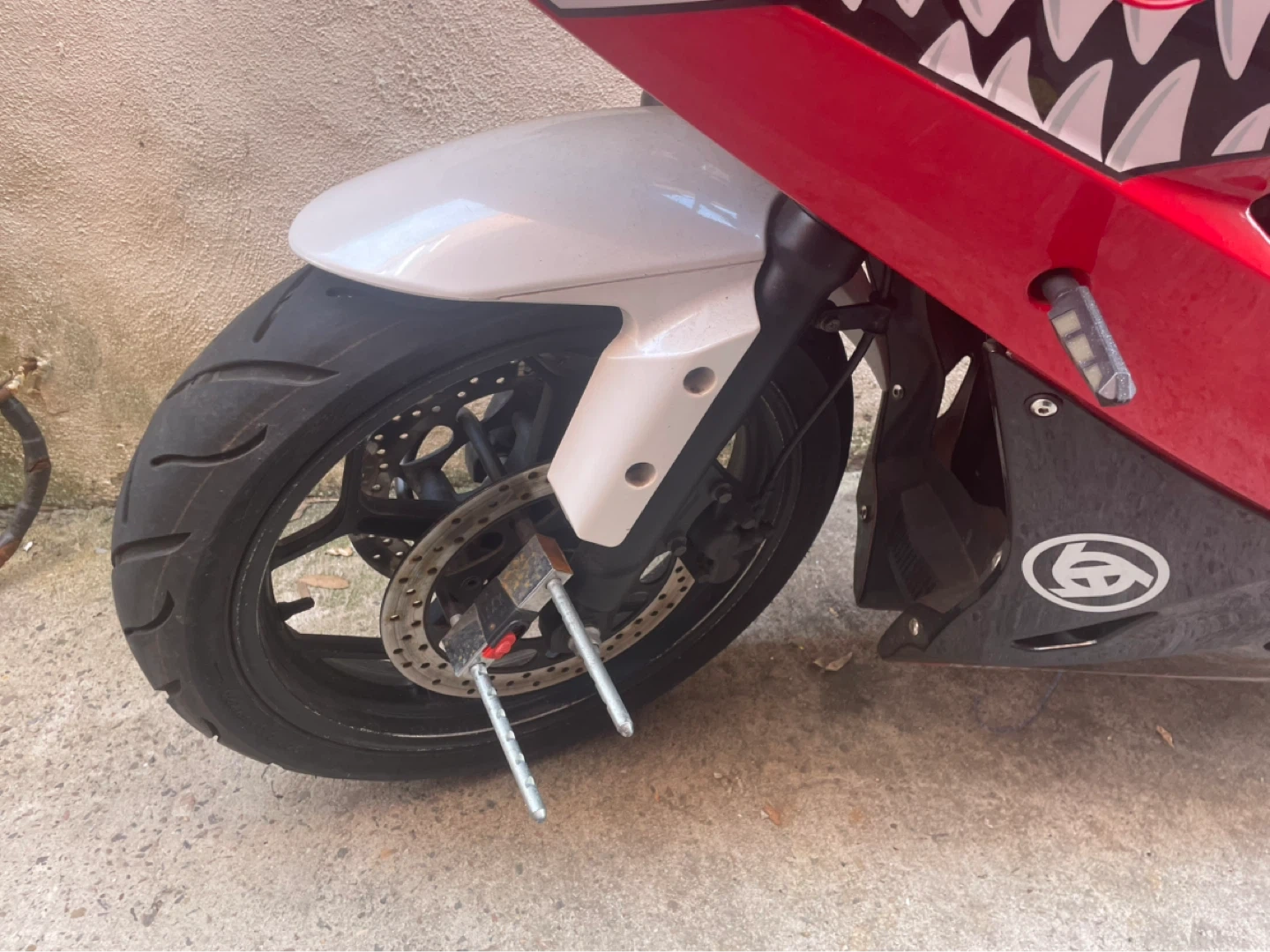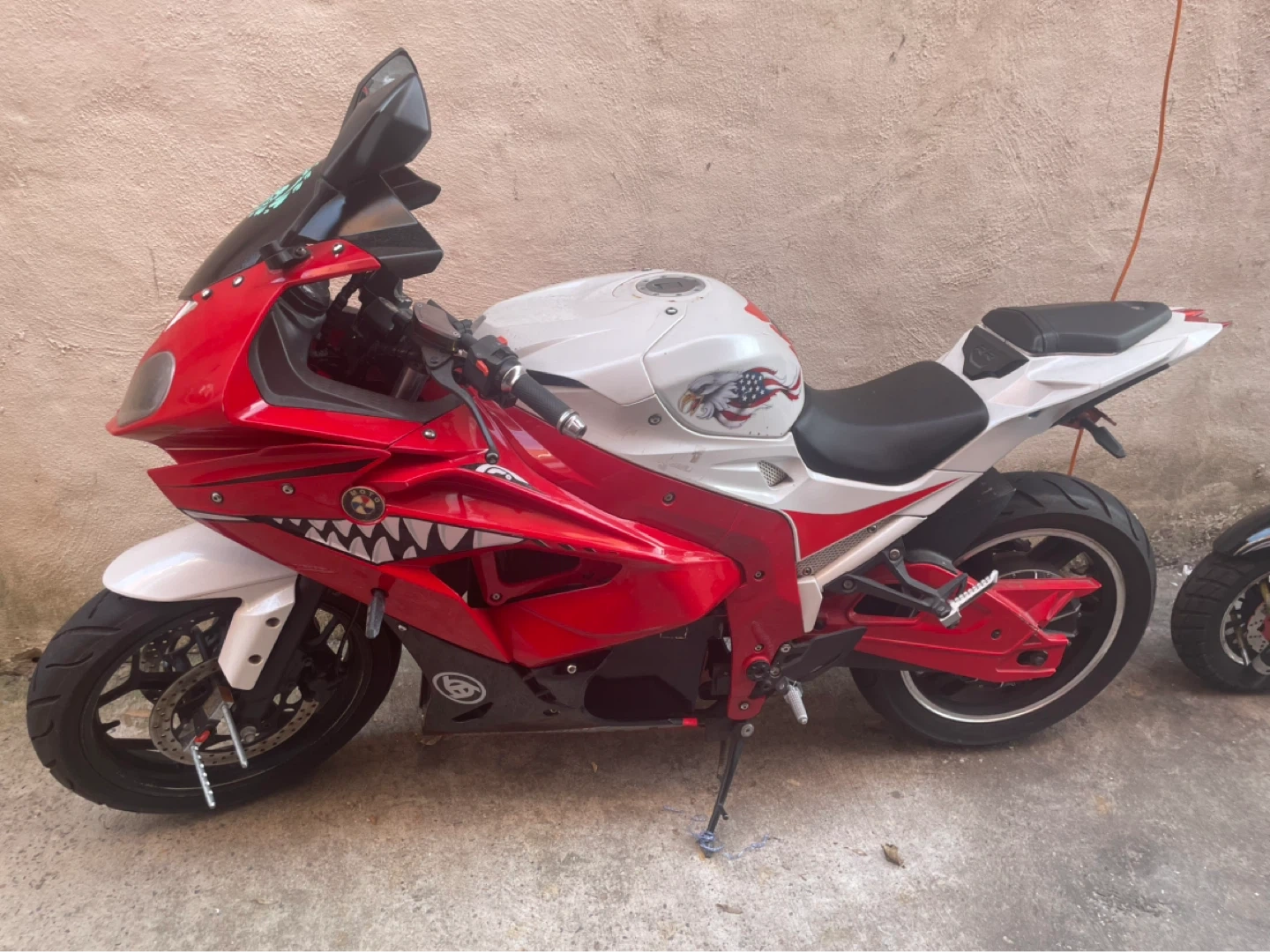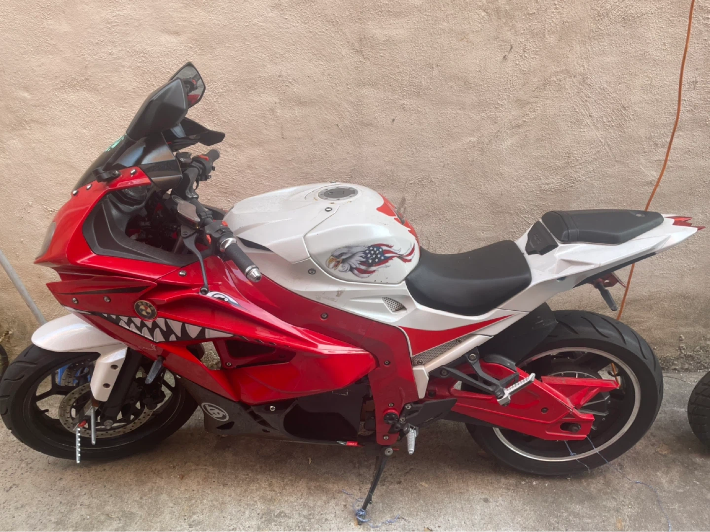 This is a red and white sport motorcycle. It has a sleek design and features a shark mouth graphic on the fairings. The seat is black and the wheels are black with red accents. It's a stylish ride! I have receipts and everything works perfectly