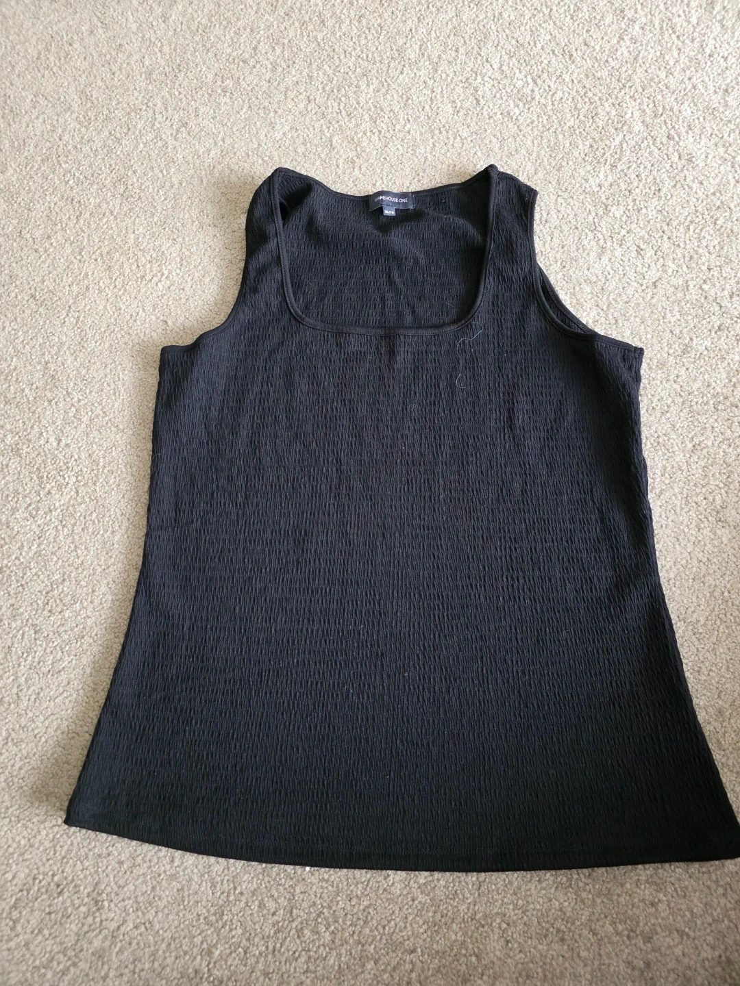 Black tank top from Warehouse One. It's a size XL/TG. The material is smocked with a textured pattern. This top is sleeveless with a square neckline.
